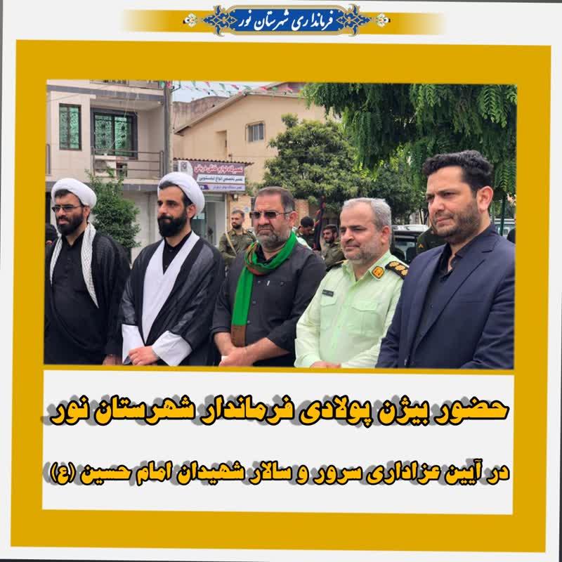 بیژن پولادی فرماندار شهرستان نور به مناسبت ایام سوگواری سرور و سالار شهیدان حضرت اباعبدالله الحسین (ع) در مراسم دسته روی مشترک هیئت عزاداری ثارالله ناحیه مقاومت بسیج سپاه ناحیه نور و گردان امام حسین (ع) و هیئت عزاداری فرماندهی انتظامی شهرستان حضور بهم رساند.