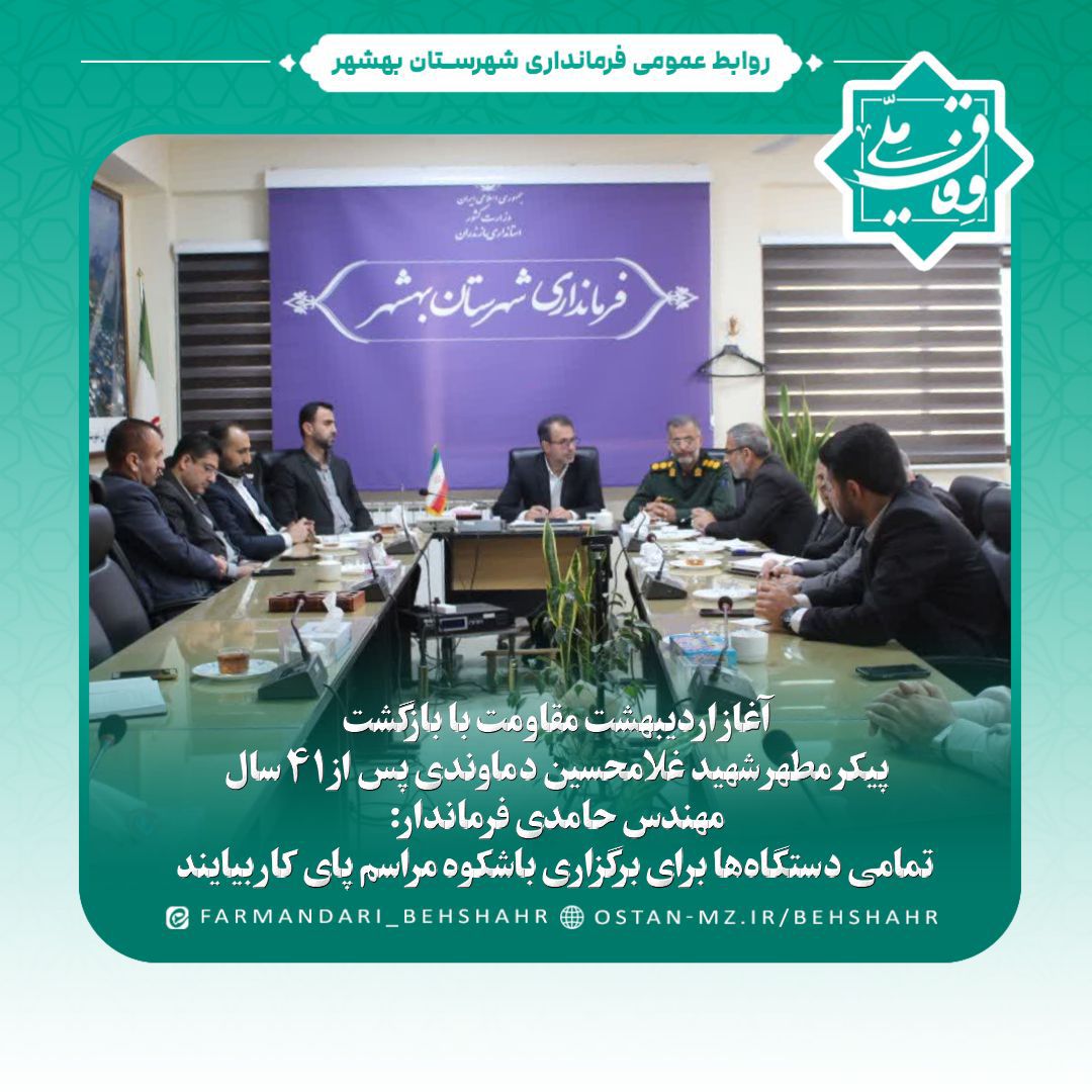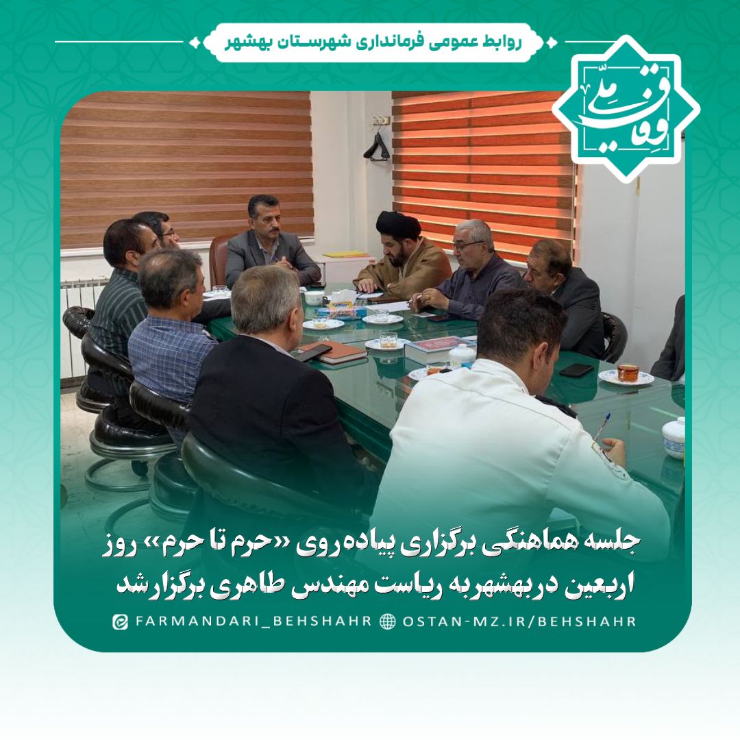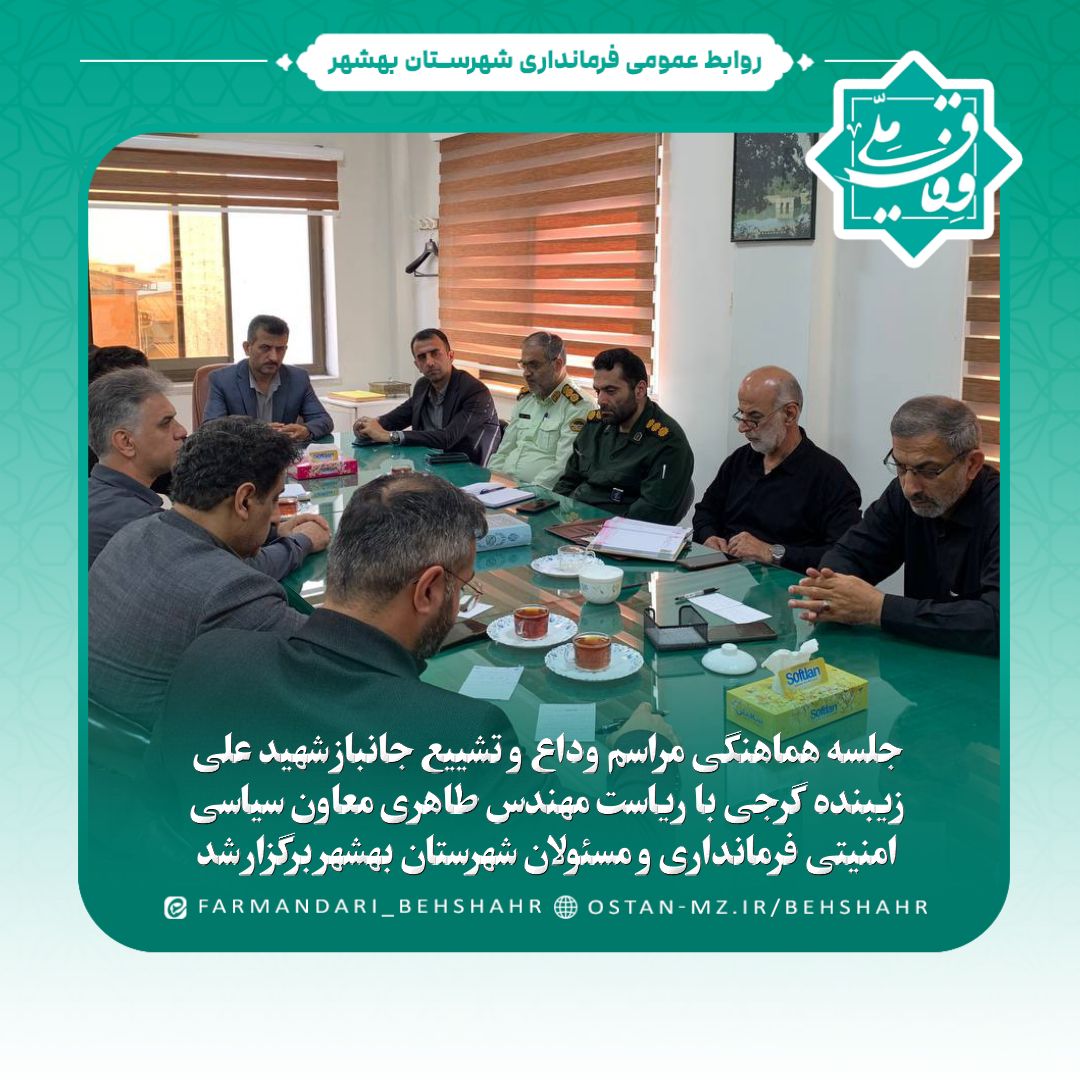 جلسه هماهنگی مراسم وداع و تشییع جانباز سرافراز دوران دفاع مقدس، شهید علی زیبنده گرجی، با حضور معاون سیاسی امنیتی فرمانداری بهشهر، بخشدار مرکزی، رئیس بنیاد شهید و امور ایثارگران، و جمعی از مسئولان شهرستانی و خانواده معظم شهید برگزار شد.