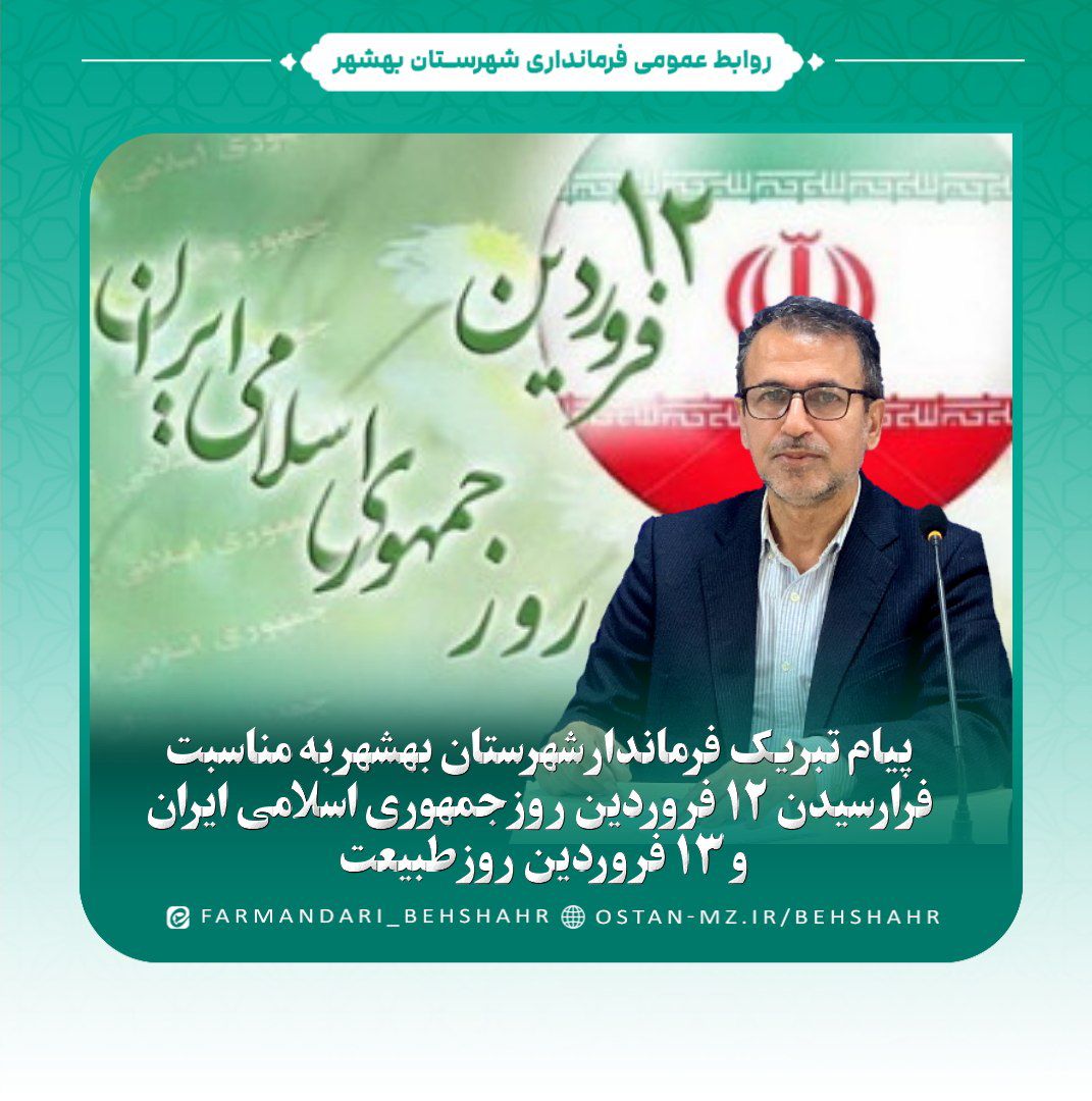پیام تبریک فرماندار شهرستان بهشهر به مناسبت فرارسیدن ۱۲ فروردین روز جمهوری اسلامی ایران و ۱۳ فروردین روز طبیعت