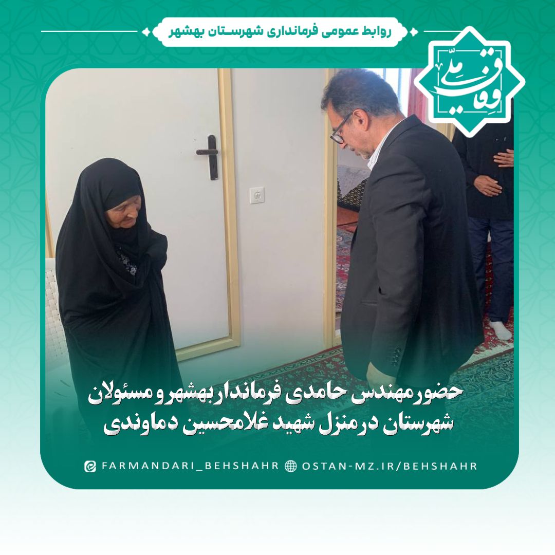 در آستانه ولادت امیرالمومنین علی (ع)،مهندس محمد حامدی فرماندار شهرستان بهشهر، یخکشی معاون سیاسی امنیتی و جباری رئیس بنیاد شهید این شهرستان، با حضور در منازل جانبازان و رزمندگان دفاع مقدس حاج مهدی صادقی و حاجی میرعبدلواحد بنی کاظمی، از این عزیزان ویادگاران دفاع مقدس تقدیر و تجلیل کردند.
