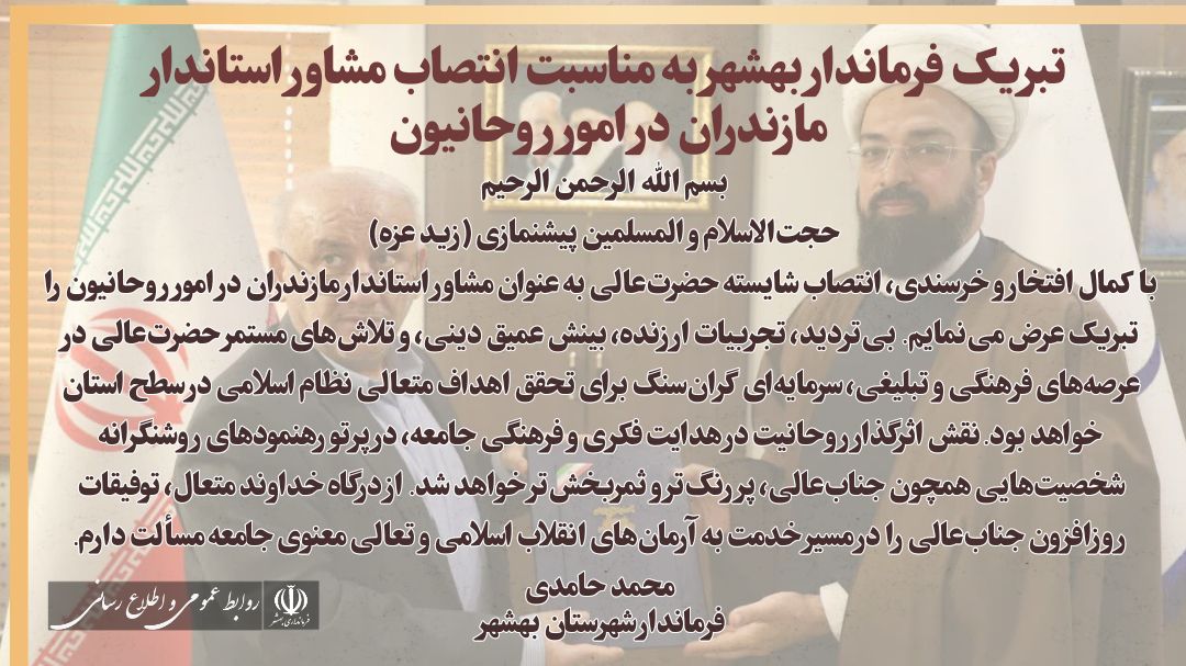 تبریک فرماندار بهشهر به مناسبت انتصاب مشاور استاندار مازندران در امور روحانیون