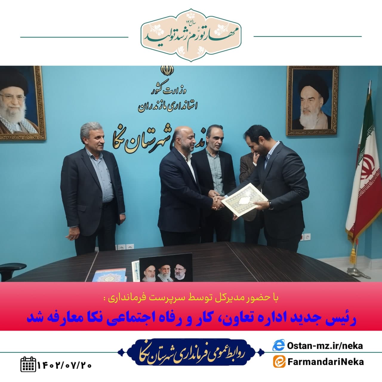 رمضانی نماینده عالی دولت در نکا ضمن تشکر از زحمات سلیمانی رئیس سابق اداره تعاون، کار و رفاه اجتماعی شهرستان، داداشی را بهعنوان سرپرست جدید این اداره معارفه کرد.