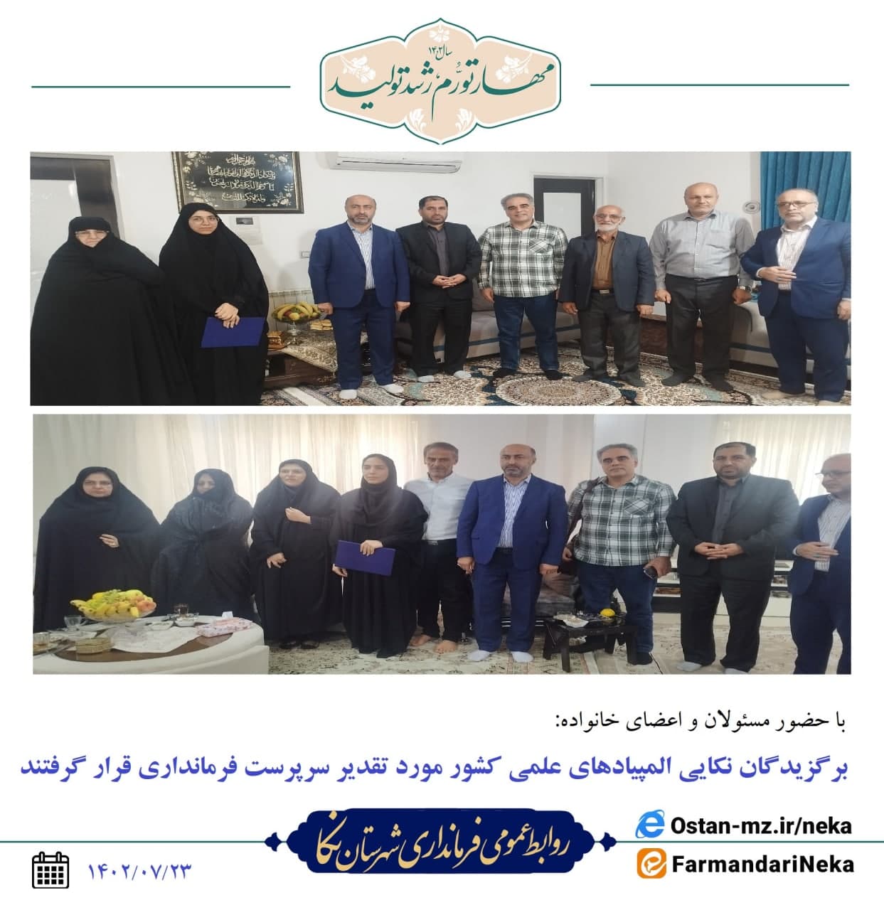 به گزارش روابط عمومی فرمانداری شهرستان نکا؛ عصر امروز مرتضی رمضانی نماینده عالی دولت در نکا با همراهی رئیس آموزش و پرورش و برخی از مسئولین به دیدار دو برگزیده المپیادهای علمی کشور خانمها ساجده ملکبالا و مهسا میرزاپورمیانگاله رفتند.