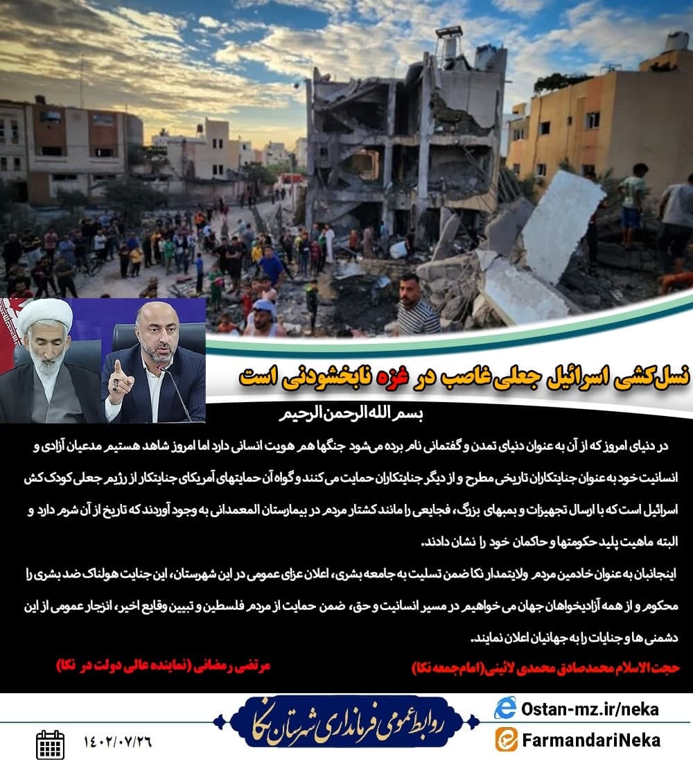 اینجانبان بهعنوان خادمین مردم ولایتمدار نکا ضمن تسلیت به جامعه بشری و اعلان عزای عمومی در این شهرستان، این جنایت هولناک ضد بشری را محکوم و از همه آزادیخواهان جهان میخواهیم در مسیر انسانیت و حق، ضمن حمایت از مردم فلسطین و تبیین وقایع اخیر، انزجار عمومی از این دشمنیها و جنایات را به جهانیان اعلان نمایند.