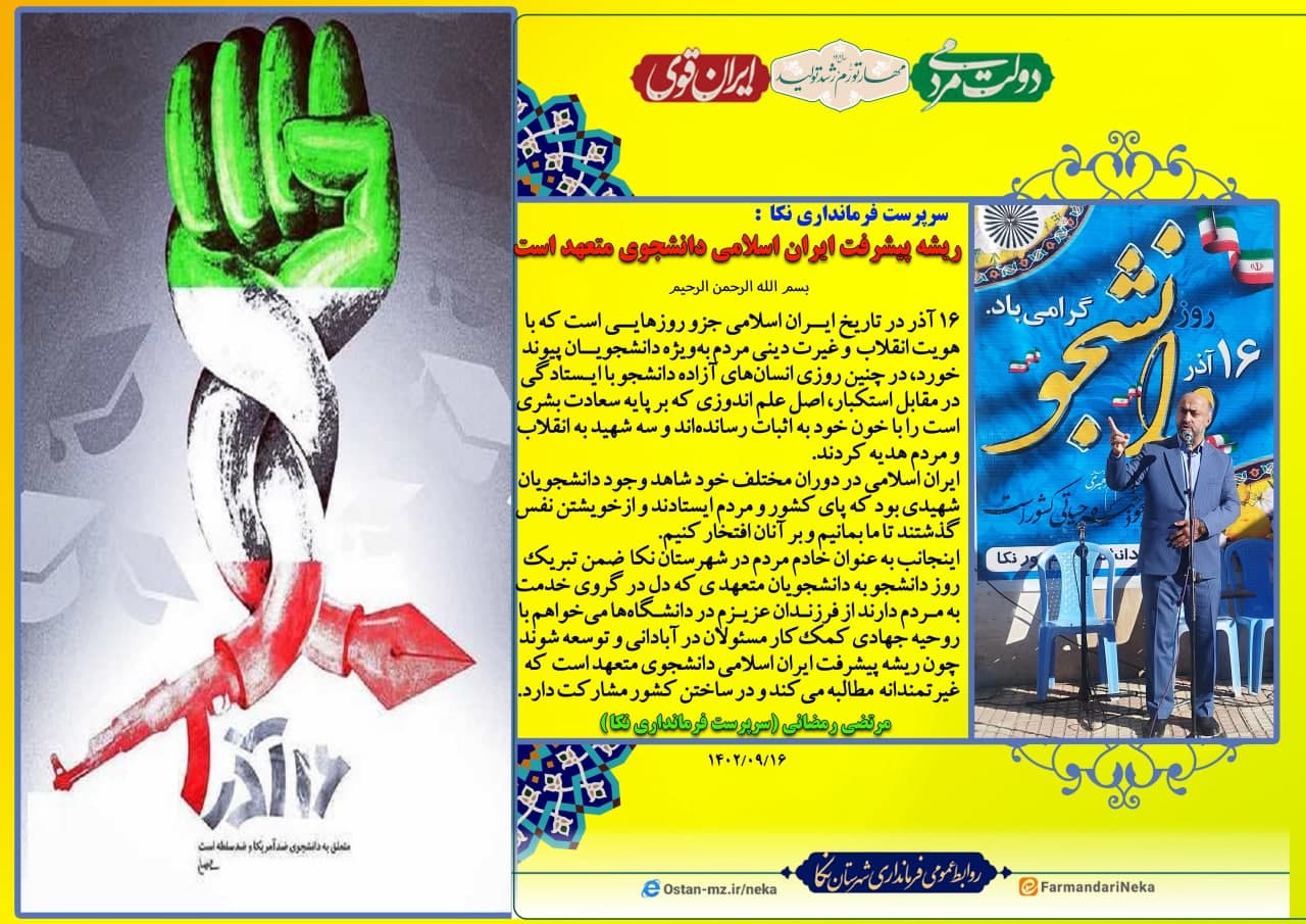 16 آذر در تاریخ ایــران اسلامی جزو روزهایــی است که با هویت انقلاب و غیرت دینی مردم بهویژه دانشجویــان پیوند خورد، در چنین روزی انسانهای آزاده دانشجو با ایـستادگی مقابل استکبار، اصل علماندوزی که بر پایه سعادت بشری است را با خون خود به اثبات رساندهاند و سه شهید به انقلاب و مردم هدیه کردند.