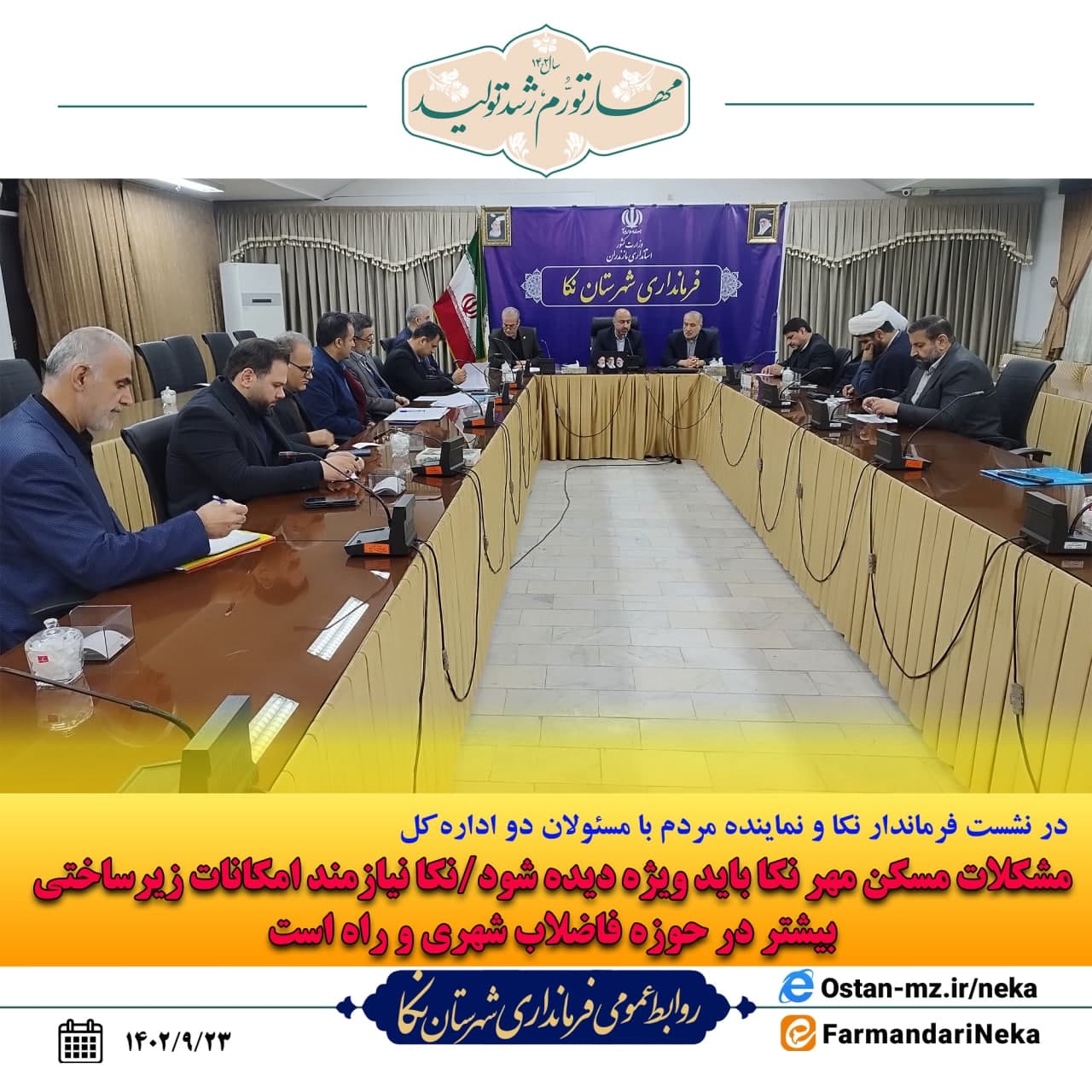 به گزارش روابطعمومی فرمانداری شهرستان نکا، نشست پیگیری حل مشکلات شهرک شهید سلیمانی(مسکن مهر) نکا با هدف برطرف کردن نیازهای ساکنین این منطقه با پیگیری جدی و به میزبانی مرتضیرمضانی، فرماندار و با حضور دکتر غلامرضاشریعتی، نماینده مردم شرق مازندران در مجلس و بهزاد برارزاده، مدیرعامل آب و فاضلاب مازندران به همراه معاون مدیرکل راه و شهرسازی استان و جمعی از مسئولان ادارههای مختلف برگزار گردید.