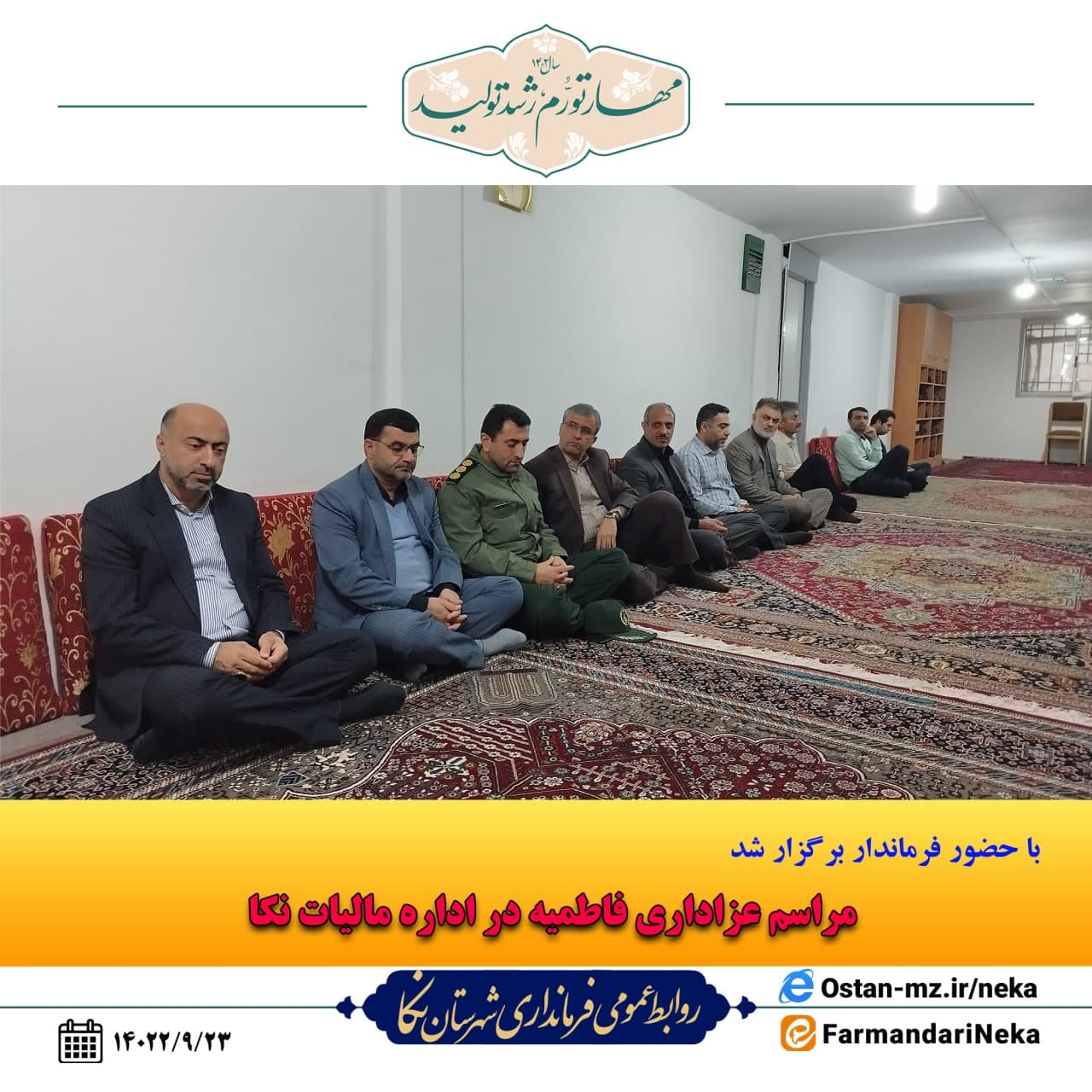 ظهر امروز مراسم عزاداری ایام شهادت حضرت فاطمه (س) با حضور مرتضی رمضانی فرماندار شهرستان نکا و کارکنان اداره امور مالیاتی در این اداره برگزار شد.