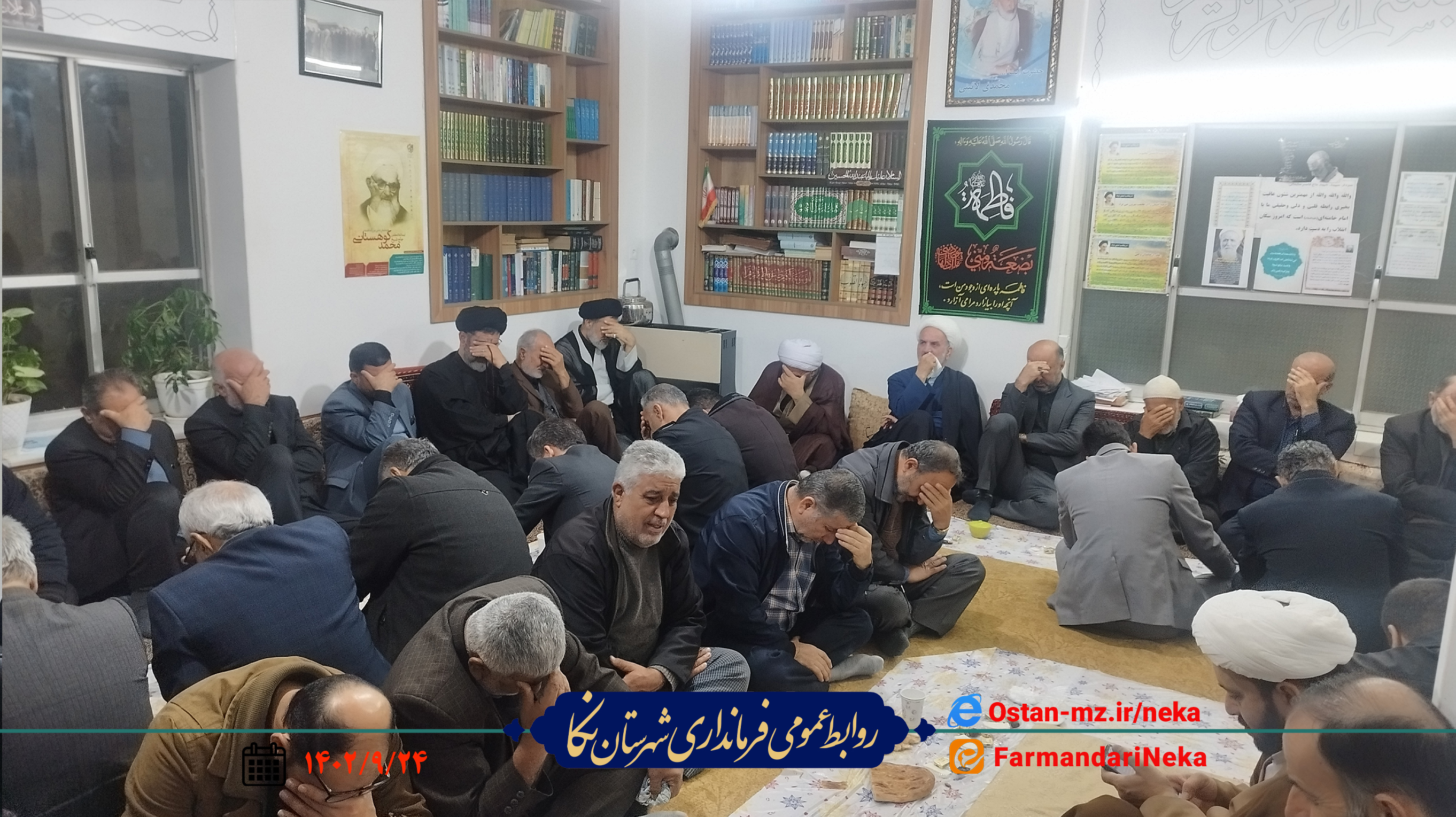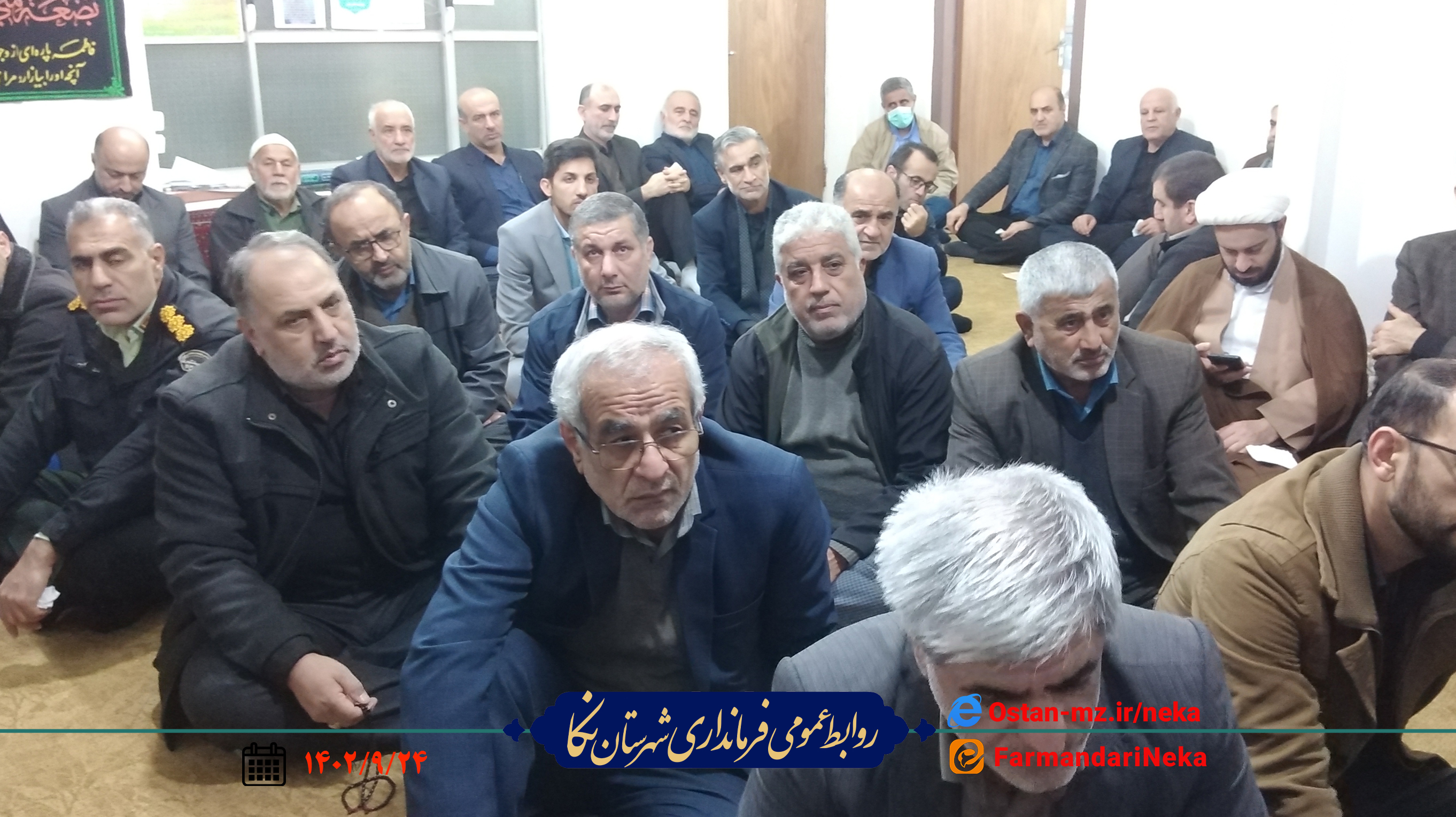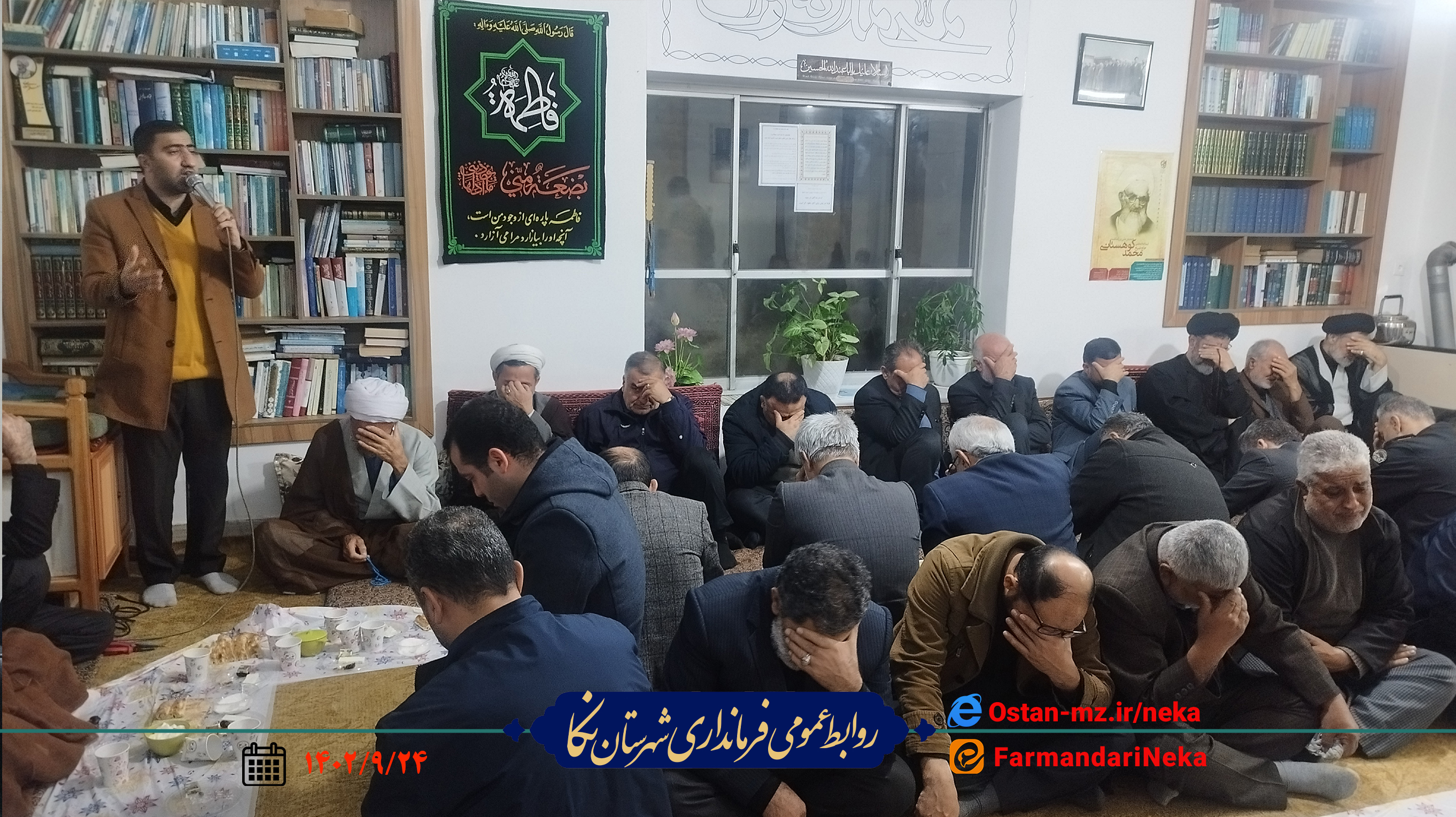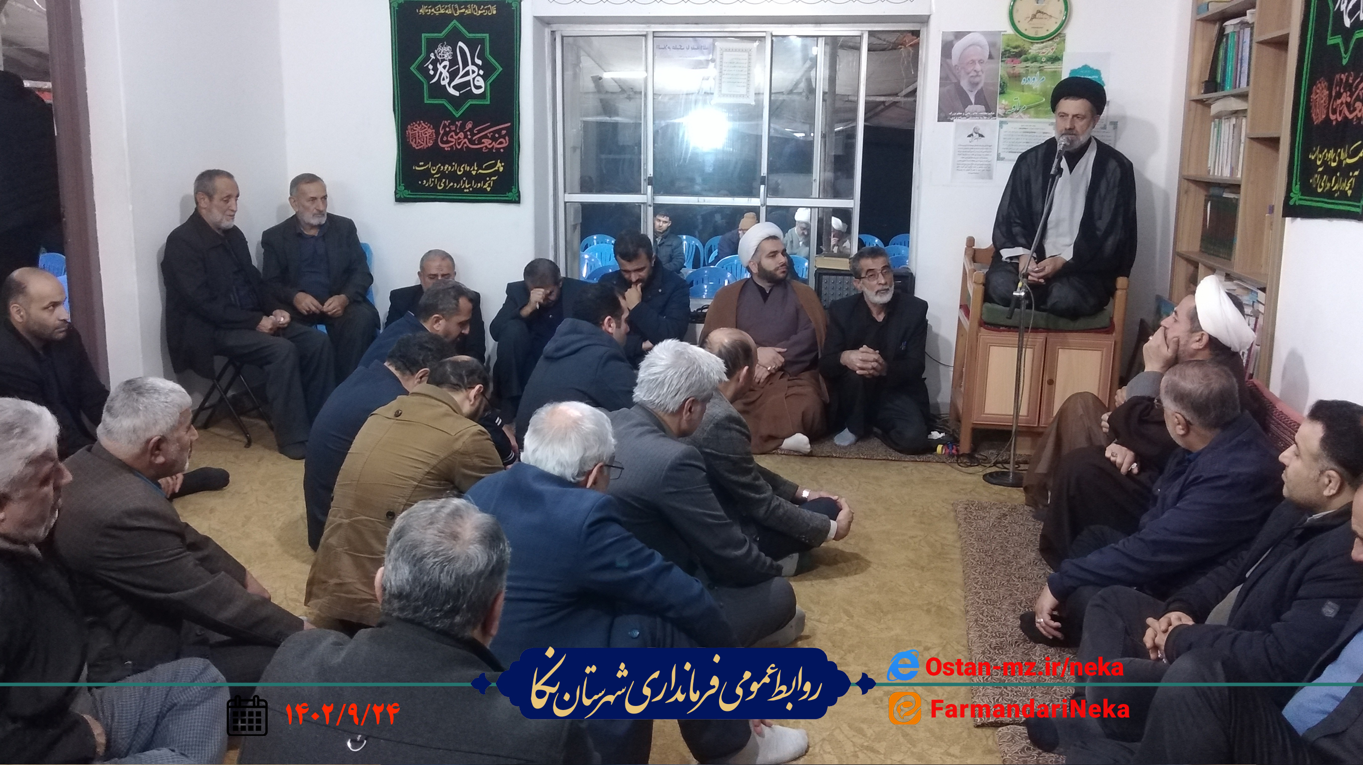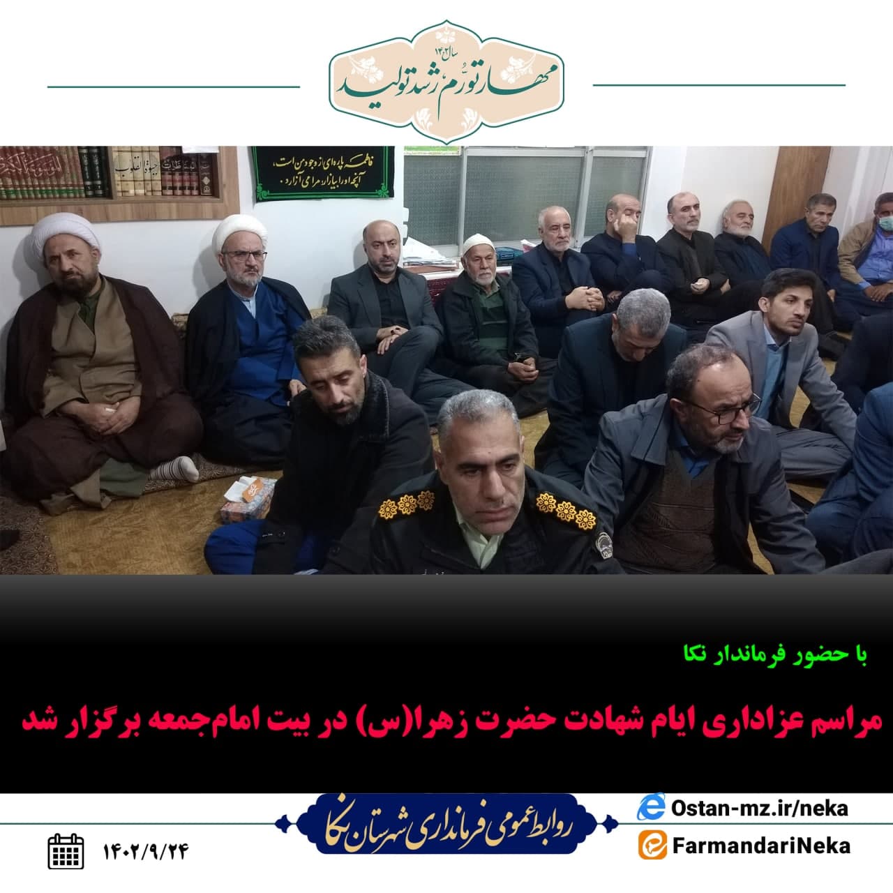 مراسم عزاداری شهادت امالائمه، حضرت فاطمه زهرا (س) صبح امروز ۲۴ آذرماه به میزبانی حجتالاسلام و المسلمین محمدصادق محمدی لائینی امام جمعه نکا و با حضور مرتضیرمضانی فرماندار و مسئولین شهرستان همراه با سخنرانی حجتالاسلام والمسلمین یوسفنژاد مسئول دفتر حوزه نمایندگی ولی فقیه در سپاه شهرستان ساری و مداحی کربلایی روحالله مهدویان برگزار شد.