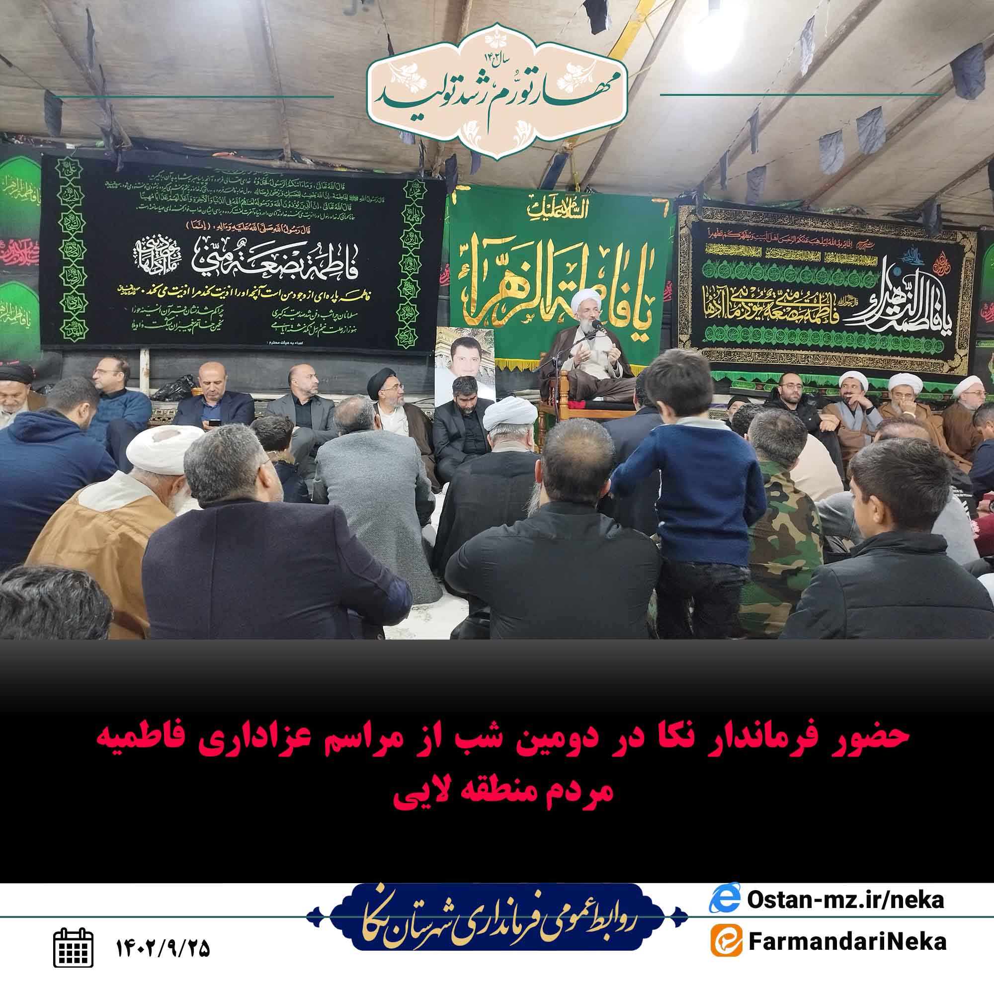 به گزارش روابطعمومی فرمانداری شهرستان نکا؛ دومین شب از مراسم عزاداری ایام فاطمیه با سخنرانی آیتالله محمدباقر محمدی لائینی نماینده ولیفقیه در استان مازندران و با حضور مرتضی رمضانی فرماندار نکا در منطقهی لایی شهرستان نکا همراه با استقبال پرشور عزاداران حضرت فاطمه زهرا (س) برگزار شد.
