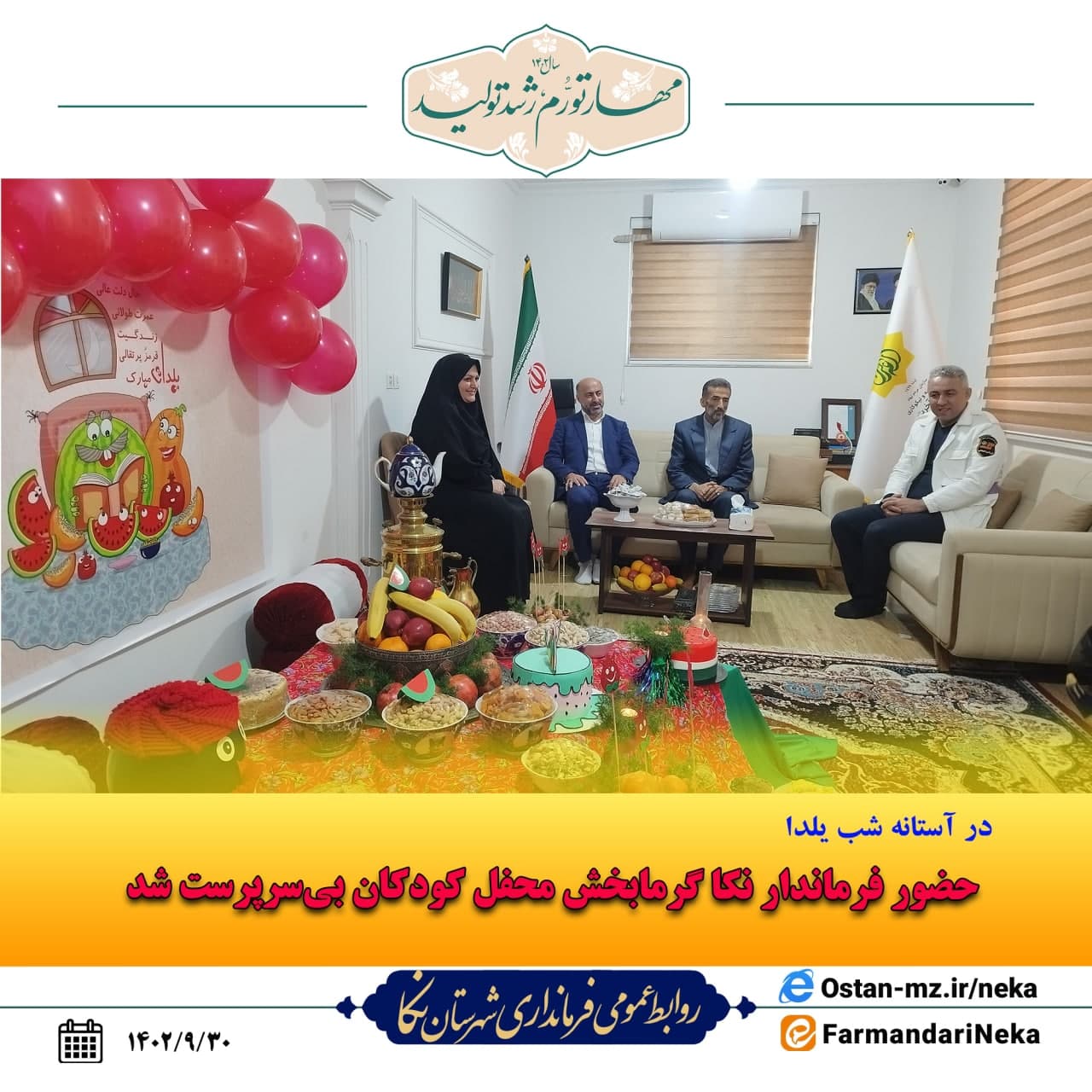 در این دیدار و دورهمی با کودکان بیسرپرست رئیس بهزیستی شهرستان و نماینده دفتر امام جمعه نکا فرماندار را همراهی کردند.