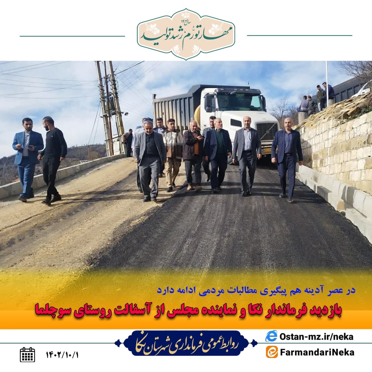 در راستای پیگیری مطالبات مردمی رمضانی فرماندار نکا و شریعتی نماینده مجلس مردم شرق مازندران با حضور در روستای سوچلما از اجرای آسفالت این منطقه بازدید کردند