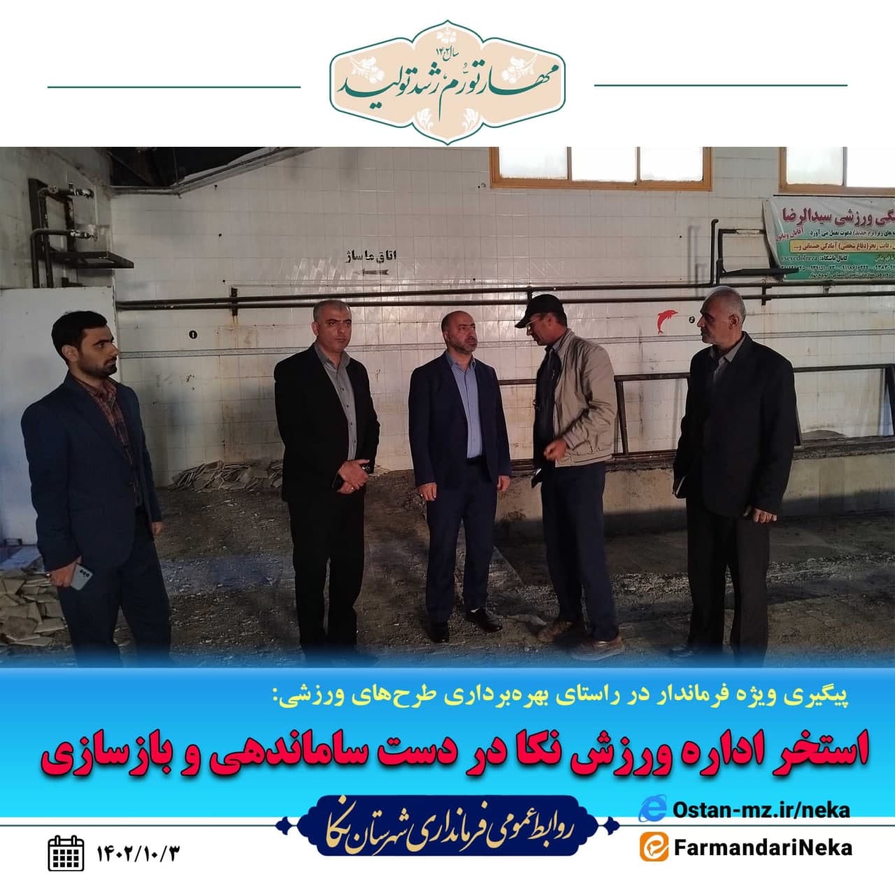 به گزارش روابطعمومی فرمانداری شهرستان نکا، عصر امروز طی بازدیدی مرتضیرمضانی فرماندار نکا از نزدیک در جریان روند اجرای طرح ساماندهی و بازسازی استخر اداره ورزش و جوانان نکا قرار گرفت.