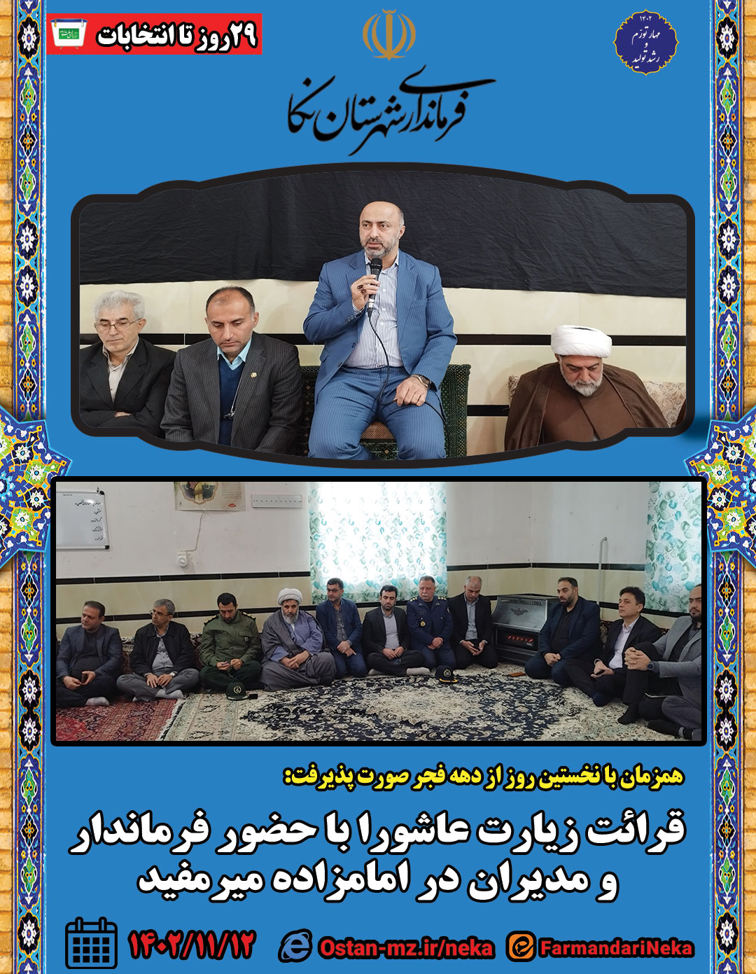به گزارش روابطعمومی فرمانداری شهرستان نکا، صبح امروز همزمان با سالروز ورود حضرت امام به کشور و نخستین روز از چهلوپنجمین دههفجر انقلاب اسلامی، مراسم قرائت زیارت پرفیض عاشورا در امامزاده میرمفید شهرستان نکا، همراه با سخنرانی فرماندار و حضور مدیران دستگاهها صورت پذیرفت.