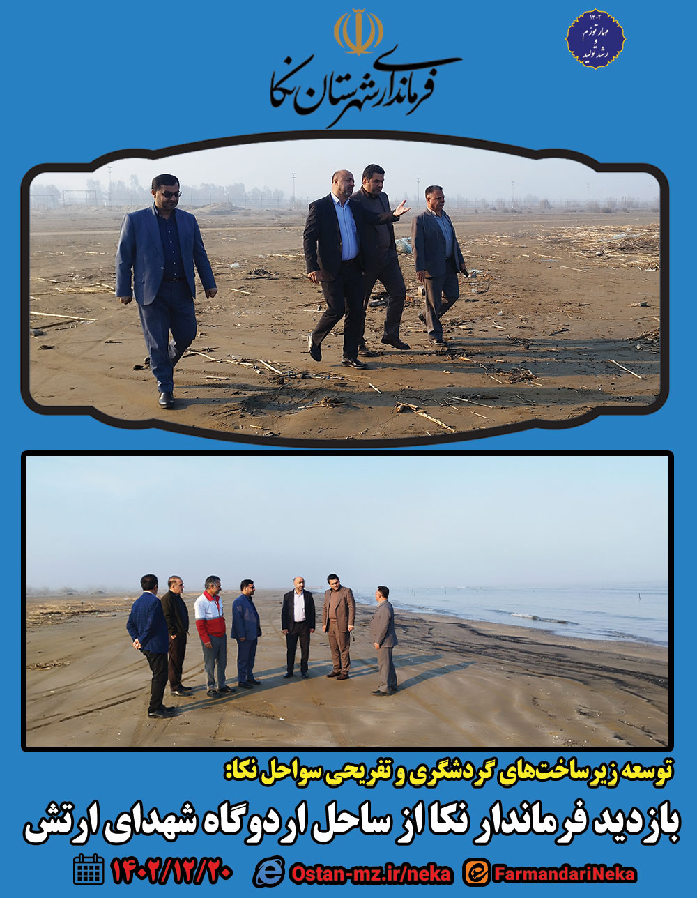 پیرو آزادسازی سواحل در دولت سیزدهم صبح امروز مرتضیرمضانی فرماندار نکا با حضور در ساحل اردوگاه شهدای ارتش به منظور توسعه زیرساختهای گردشگری و تفریحی ساحلی از این منطقه بازدید کرد.