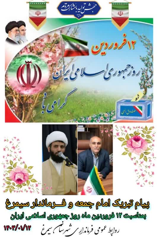 به گزارش روابط عمومی فرمانداری شهرستان سیمرغ، لهراسب رحمتی بهمنانی فرماندار و حجت الاسلام خانلری امام جمعه شهرستان سیمرغ طی پیامی مشترک ۱۲ فروردین ماه روز جمهوری اسلامی ایران را به مردم ولایتمدار سیمرغ تبریک گفتند. در متن کامل این پیام آمده است: