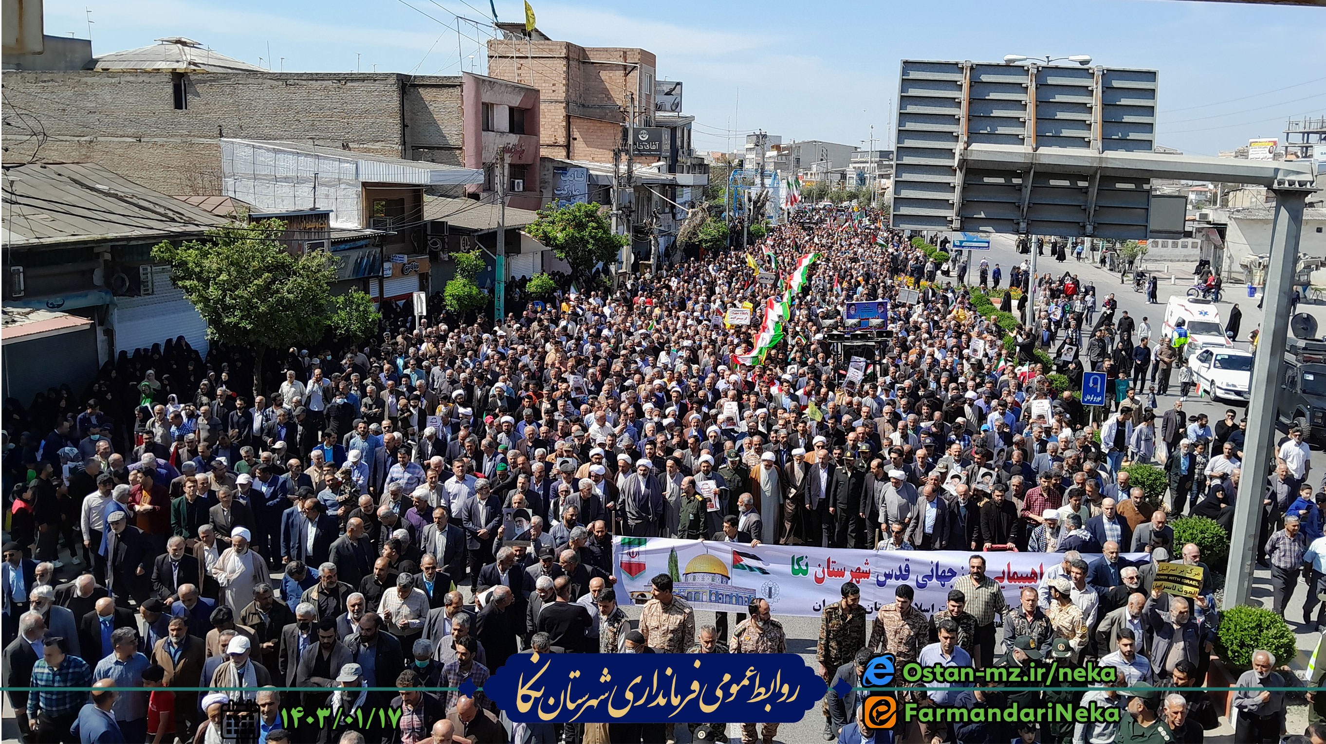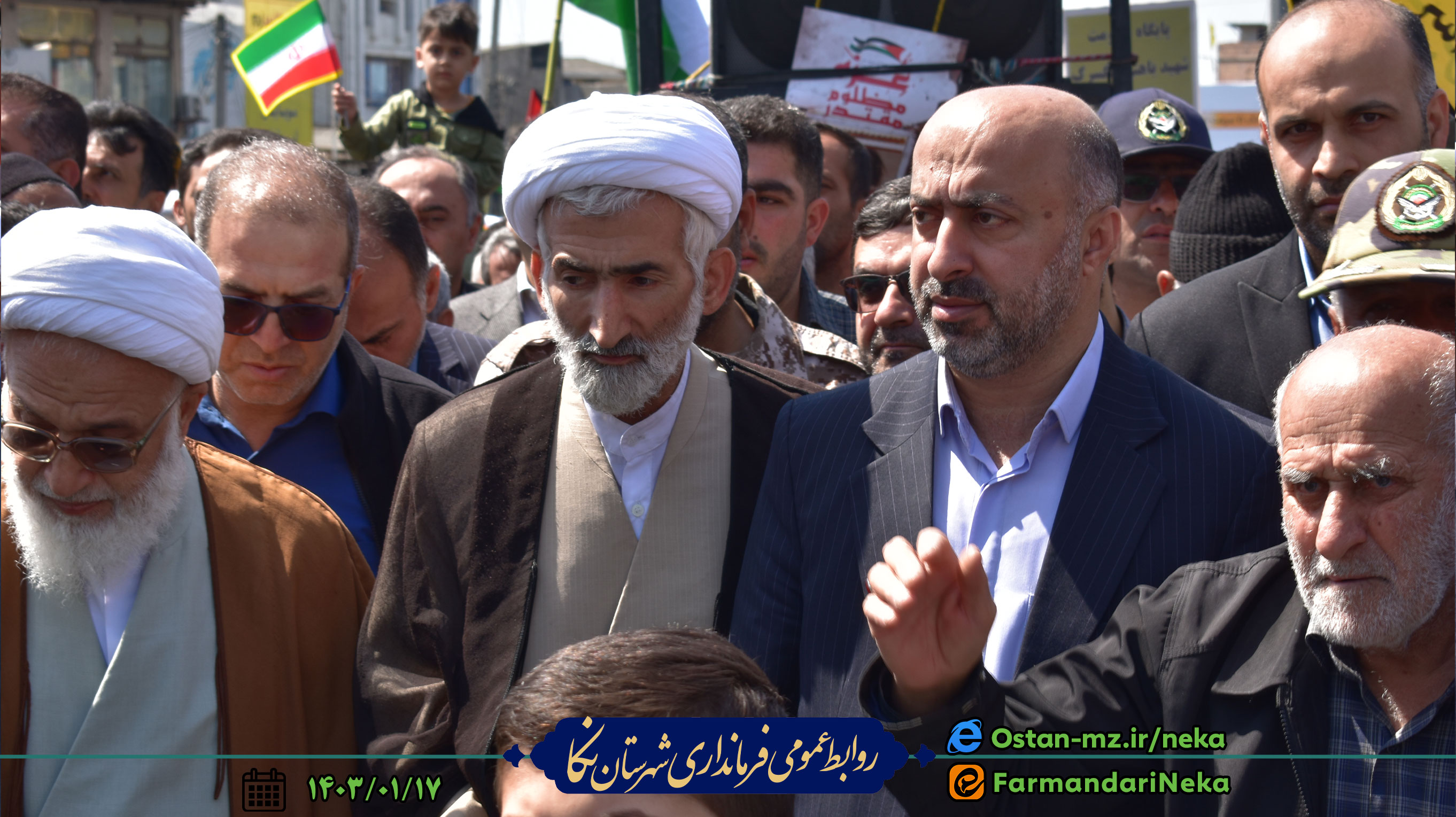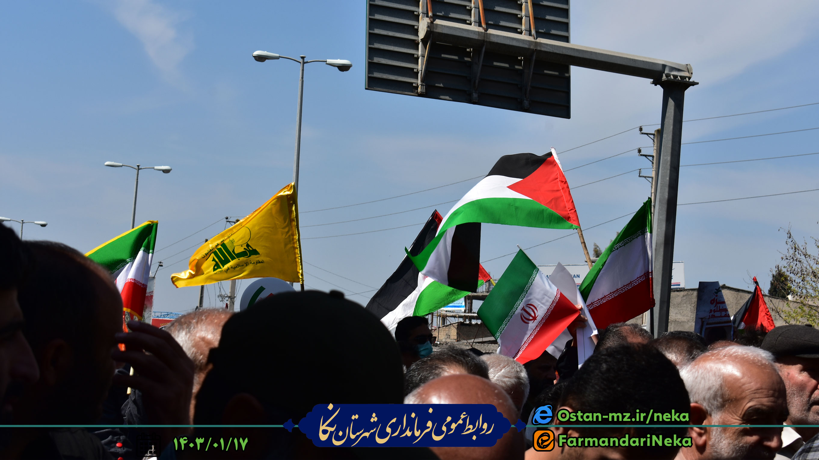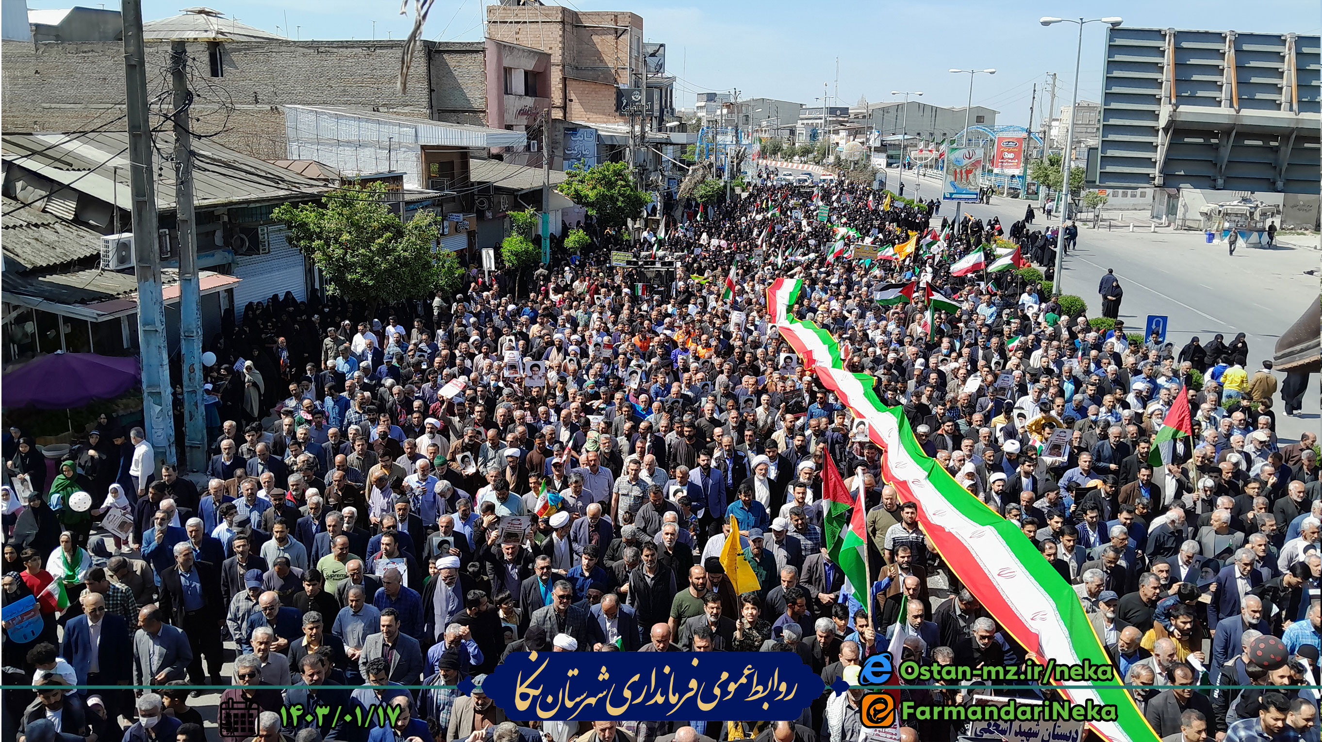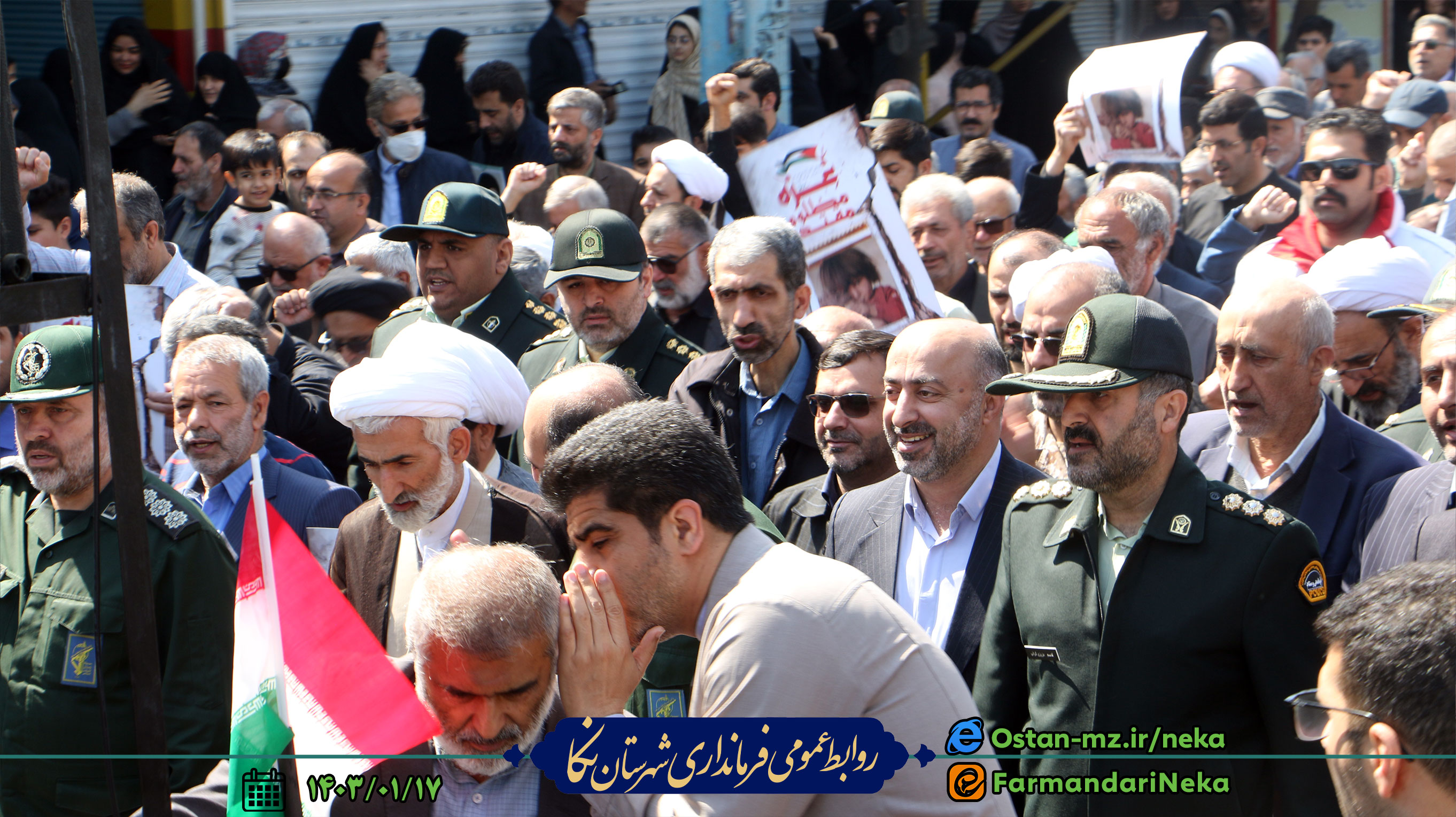 در این راهپیمایی، مردم شهرستان نکا، ضمن محکوم کردن جنایتهای رژیم صهیونیستی با سردادن شعارهای «اللهاکبر خامنهای رهبر»، «مرگ بر آمریکا» و «مرگ بر اسرائیل» از ناحیهو مقاومت بسیج شهرستان تا مصلی امام خمینی (ره) حمایت خودرا از مردم فلسطین و آزادسازی قدس اعلام کردند.