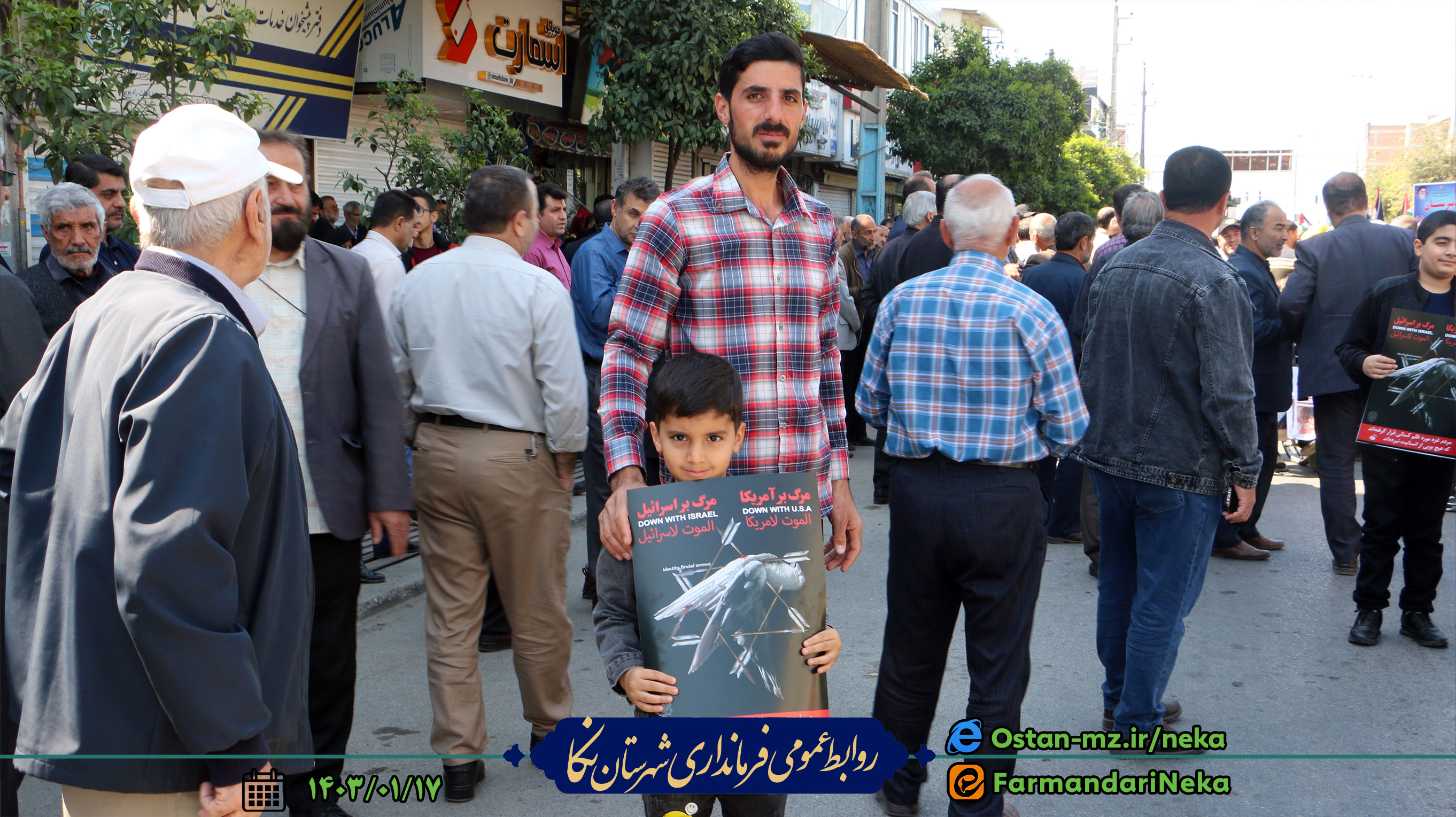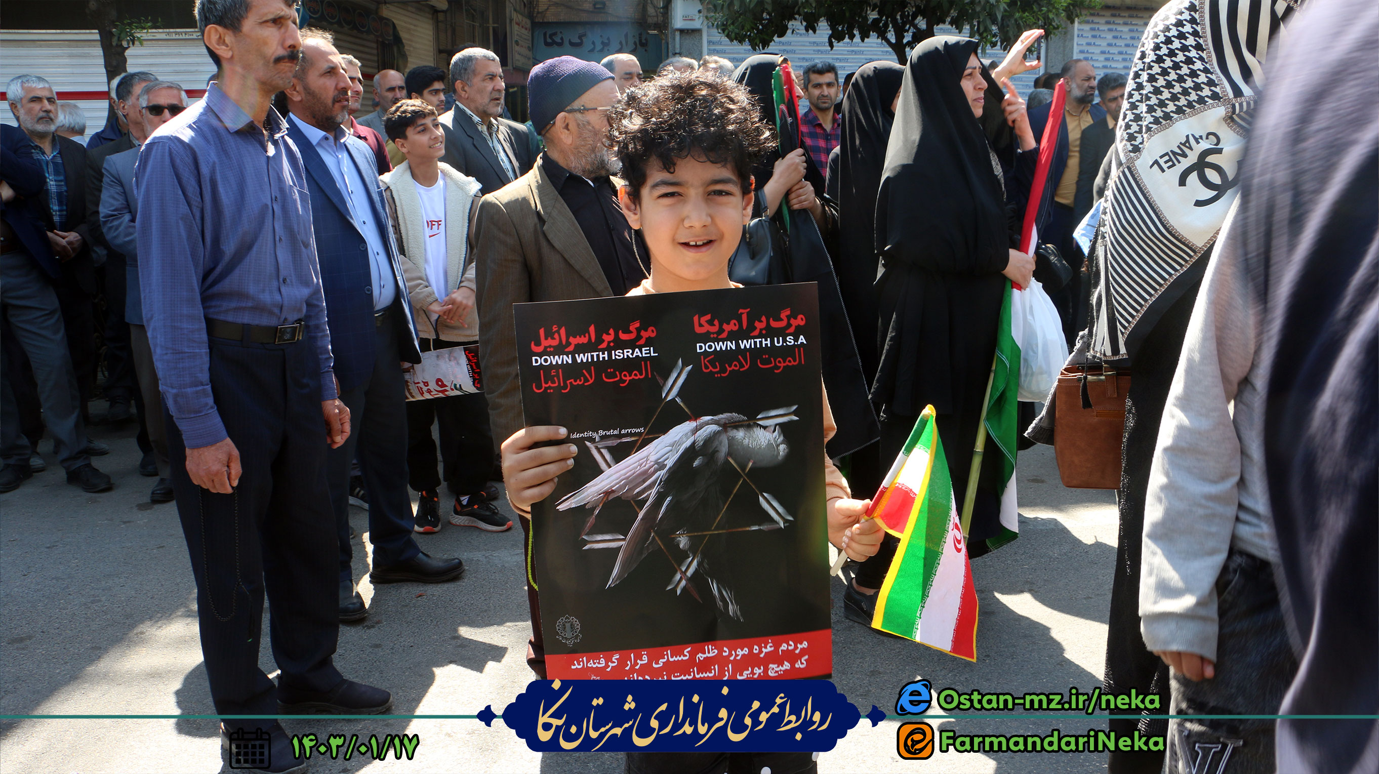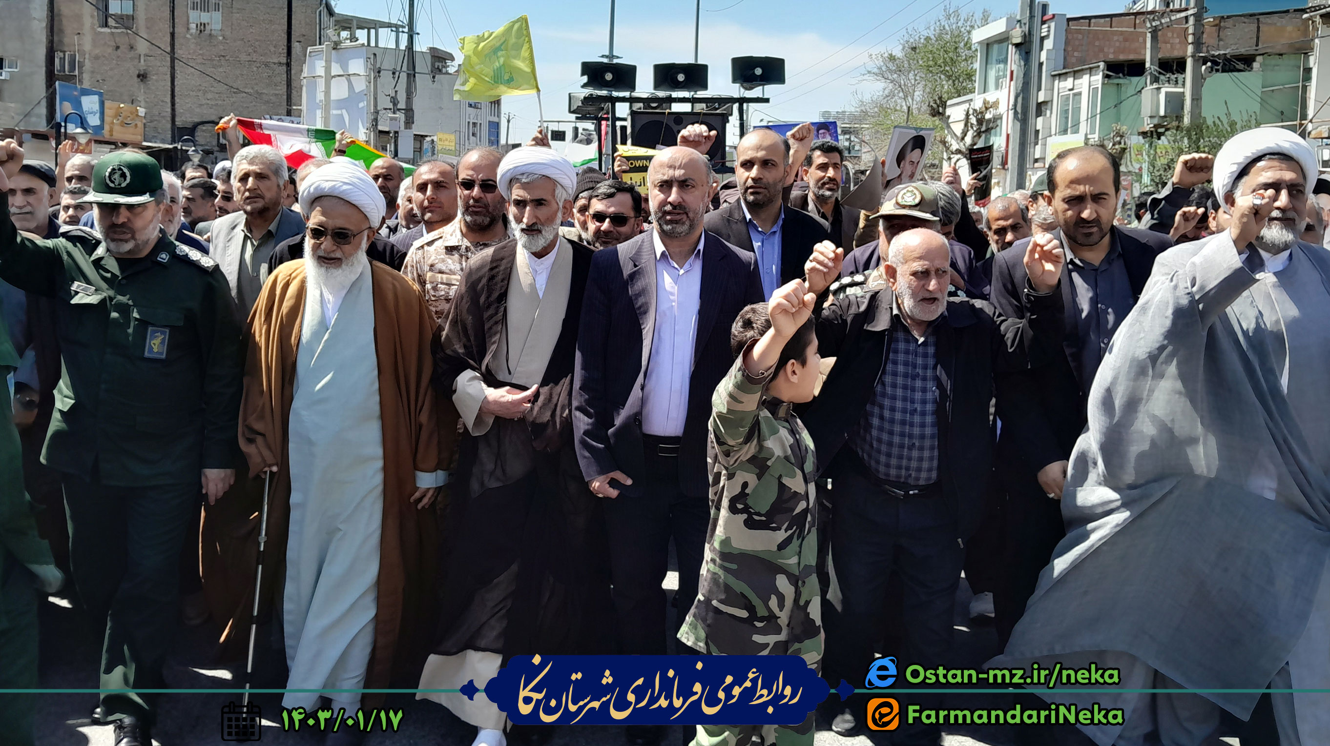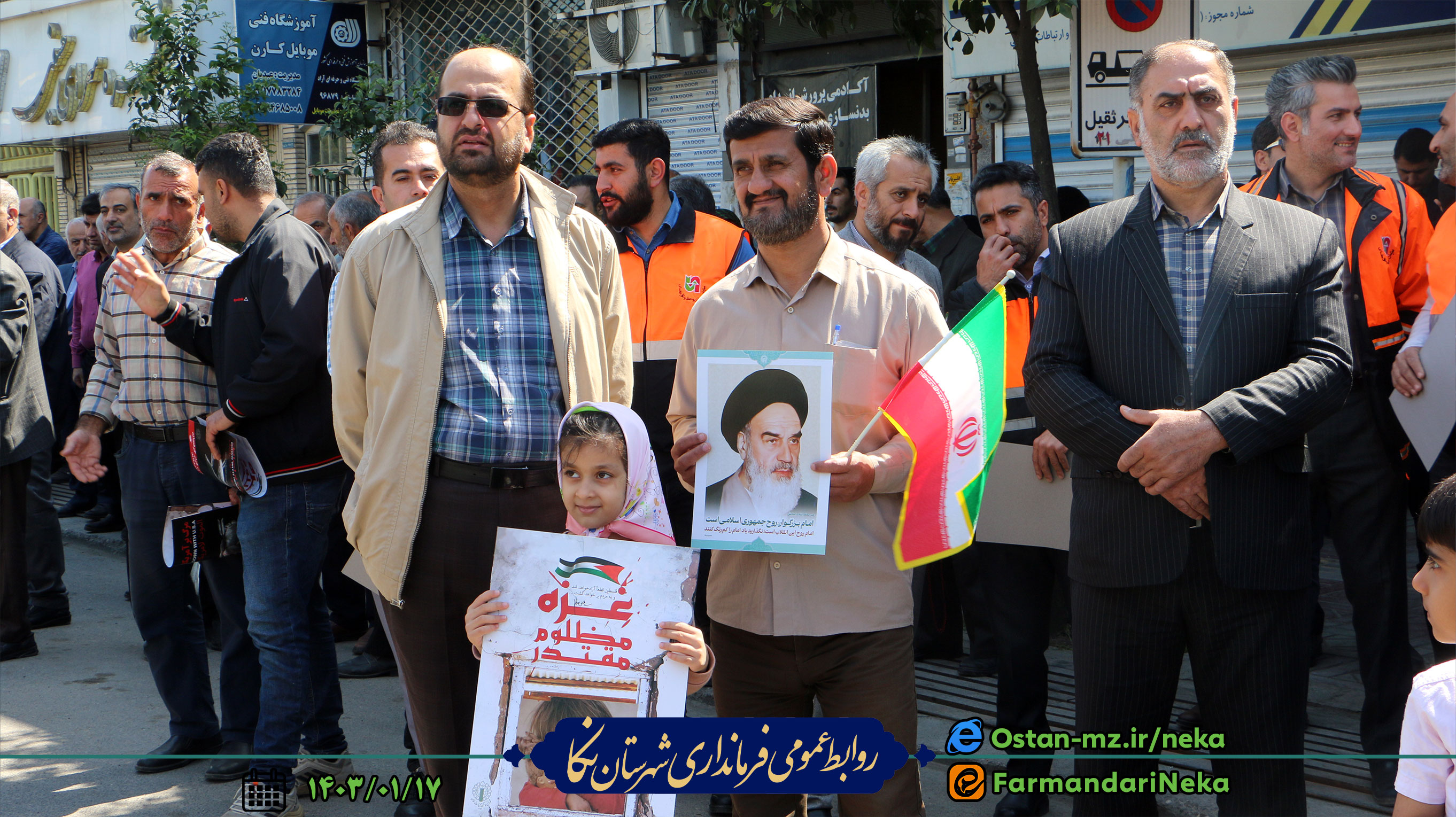 در این راهپیمایی، مردم شهرستان نکا، ضمن محکوم کردن جنایتهای رژیم صهیونیستی با سردادن شعارهای «اللهاکبر خامنهای رهبر»، «مرگ بر آمریکا» و «مرگ بر اسرائیل» از ناحیهو مقاومت بسیج شهرستان تا مصلی امام خمینی (ره) حمایت خودرا از مردم فلسطین و آزادسازی قدس اعلام کردند.