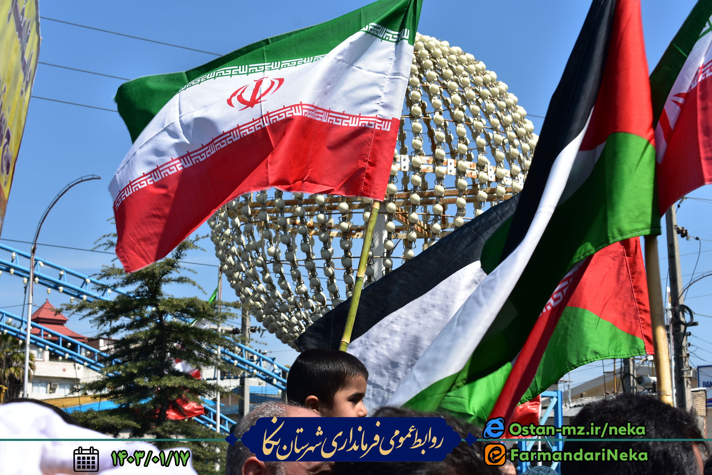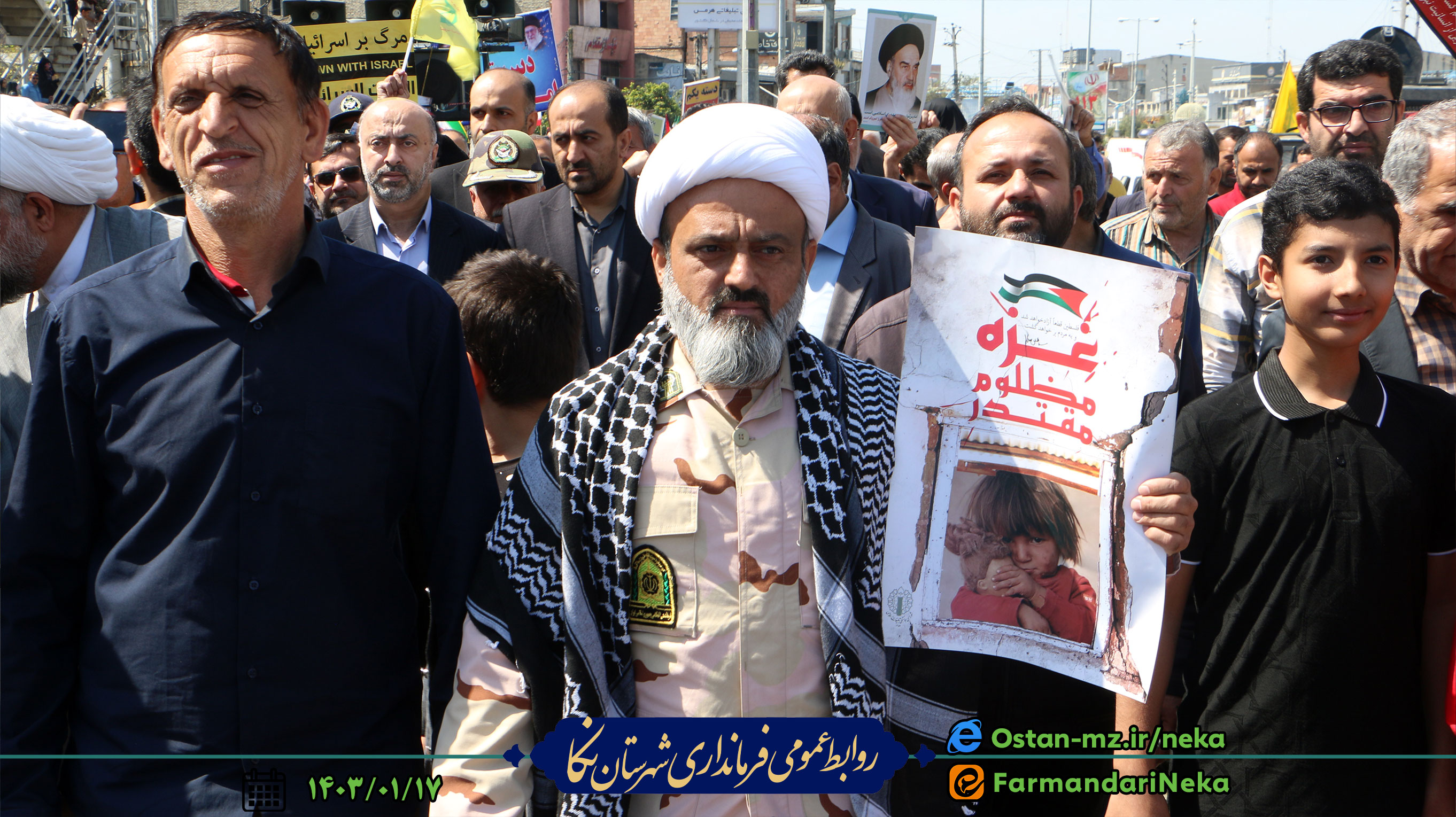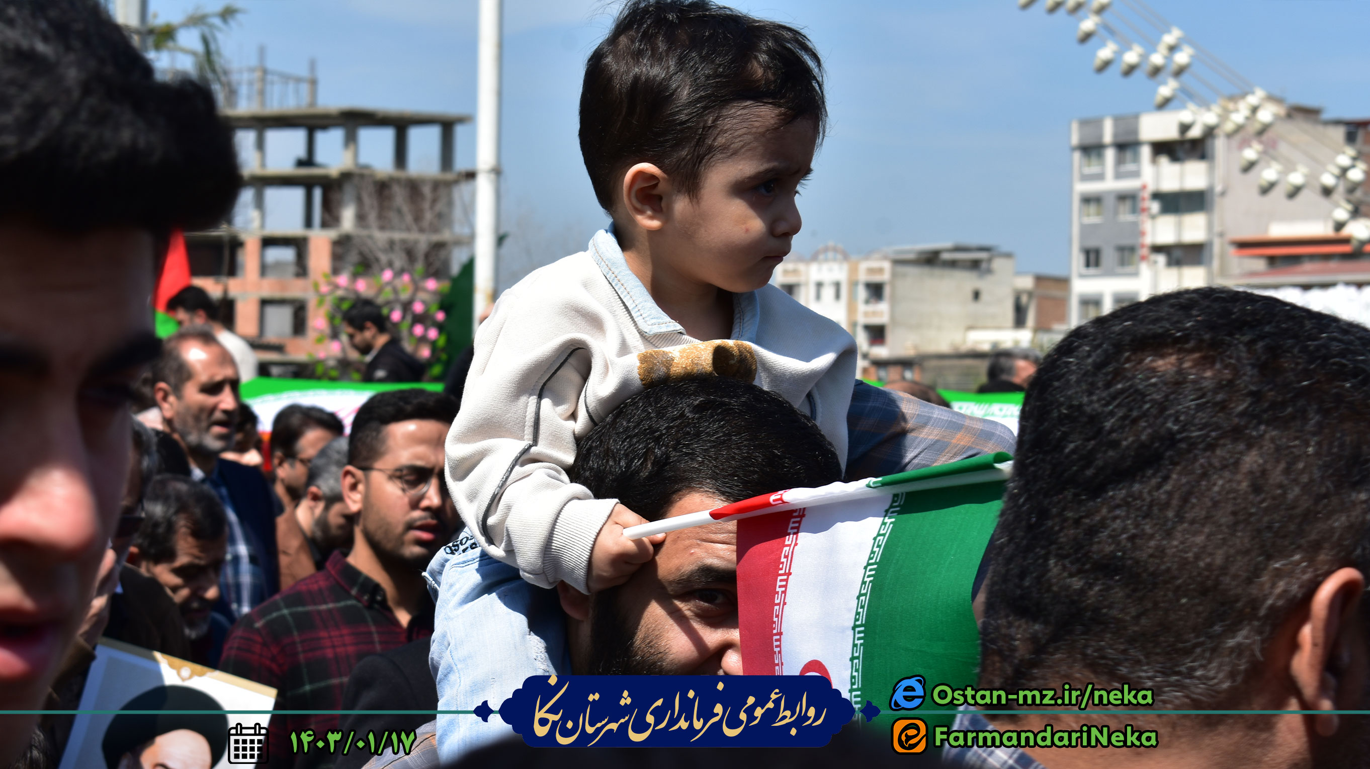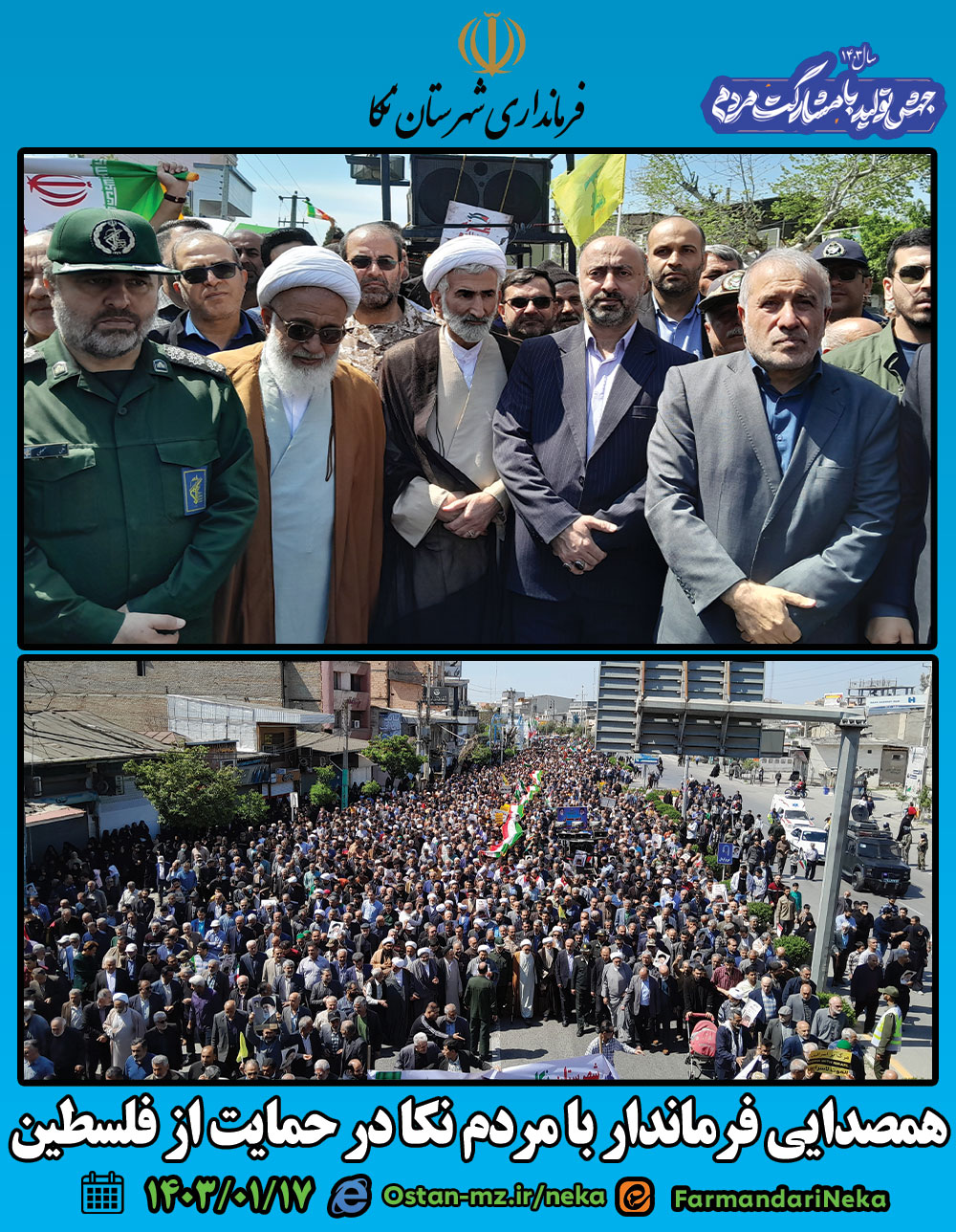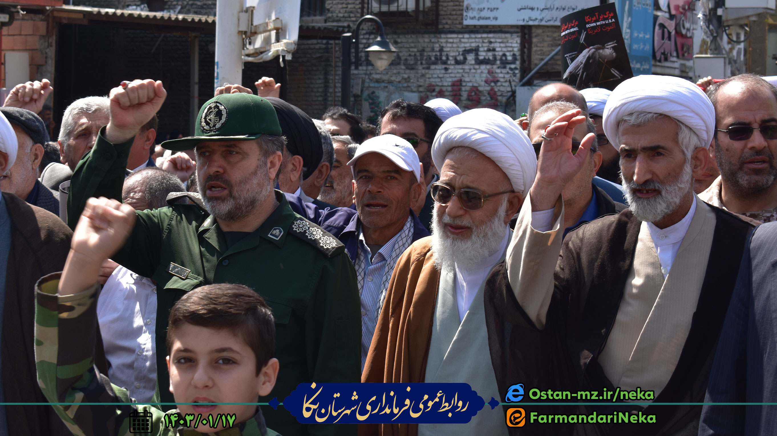 در این راهپیمایی، مردم شهرستان نکا، ضمن محکوم کردن جنایتهای رژیم صهیونیستی با سردادن شعارهای «اللهاکبر خامنهای رهبر»، «مرگ بر آمریکا» و «مرگ بر اسرائیل» از ناحیهو مقاومت بسیج شهرستان تا مصلی امام خمینی (ره) حمایت خودرا از مردم فلسطین و آزادسازی قدس اعلام کردند.