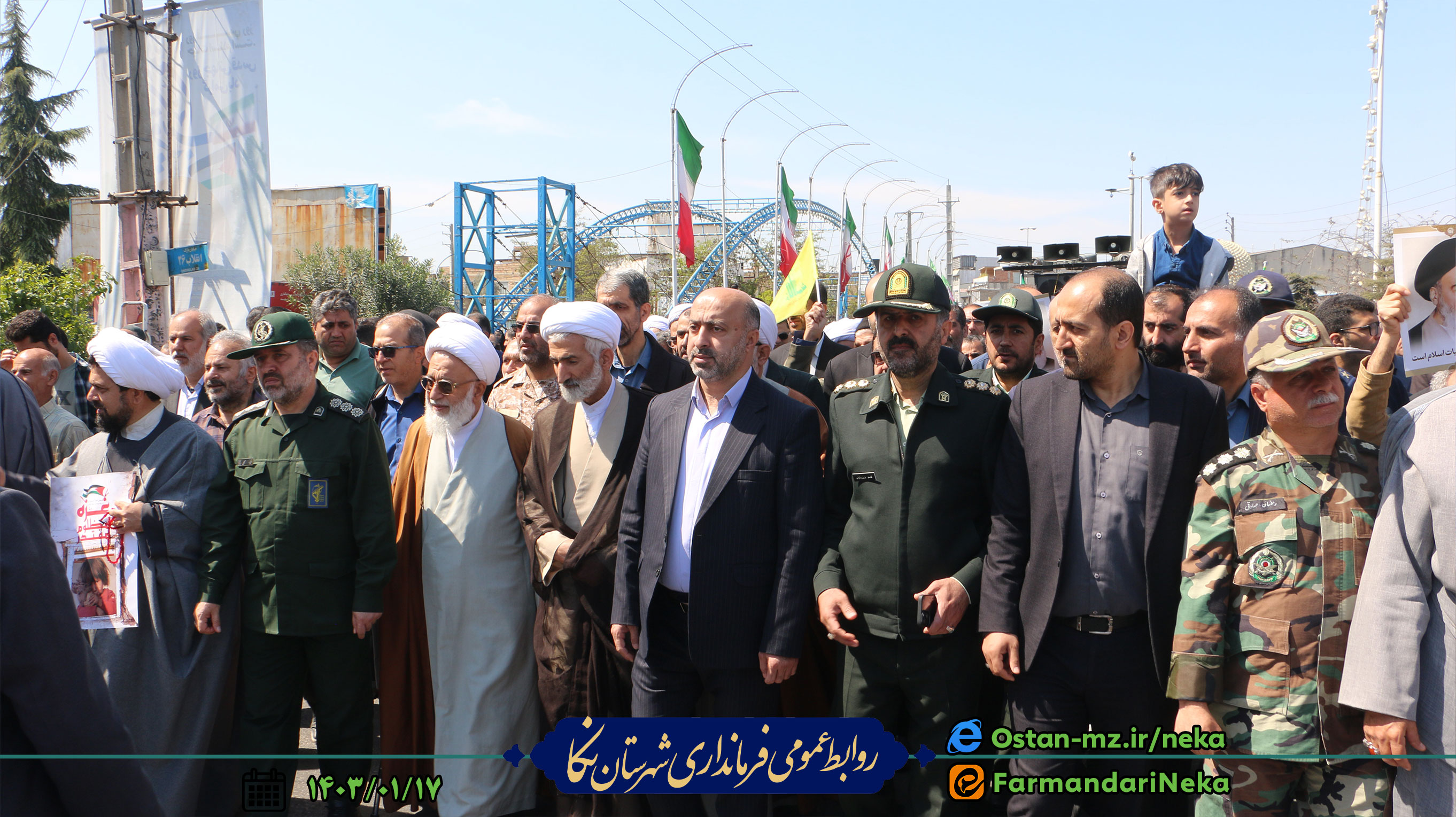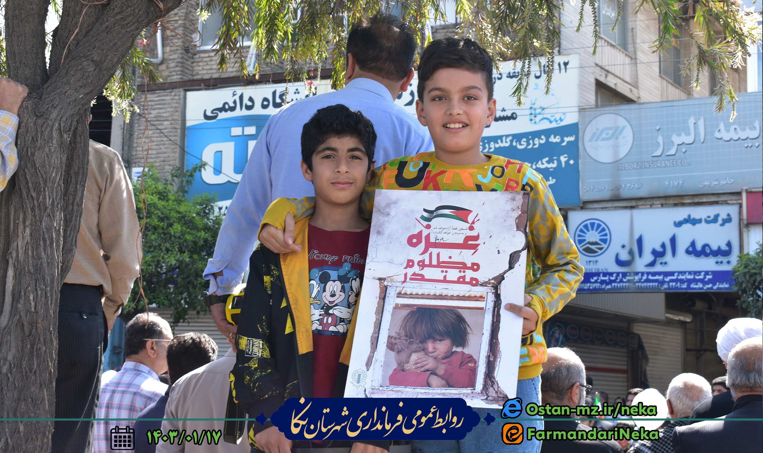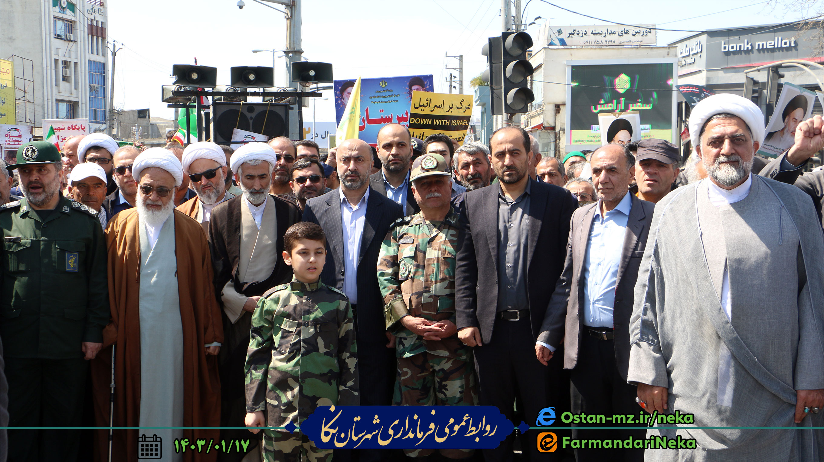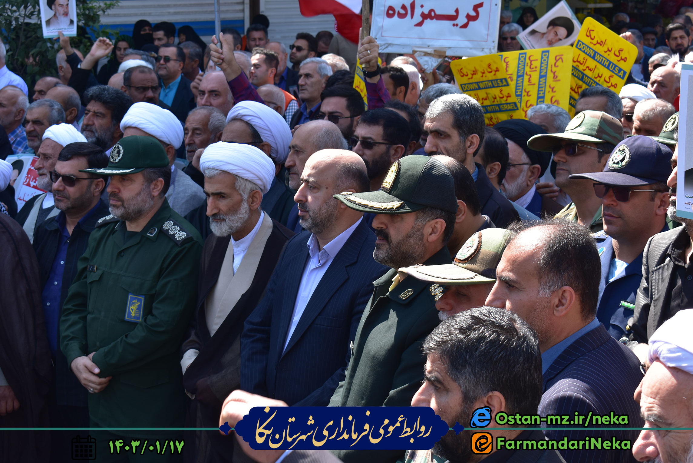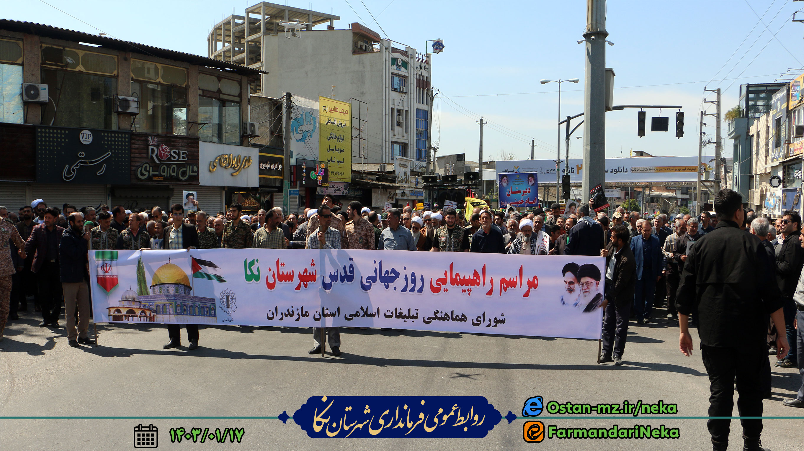 در این راهپیمایی، مردم شهرستان نکا، ضمن محکوم کردن جنایتهای رژیم صهیونیستی با سردادن شعارهای «اللهاکبر خامنهای رهبر»، «مرگ بر آمریکا» و «مرگ بر اسرائیل» از ناحیهو مقاومت بسیج شهرستان تا مصلی امام خمینی (ره) حمایت خودرا از مردم فلسطین و آزادسازی قدس اعلام کردند.
