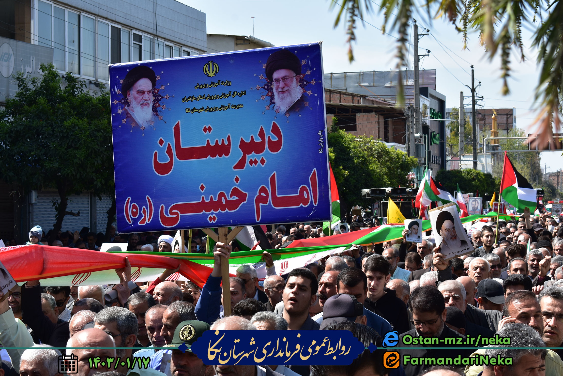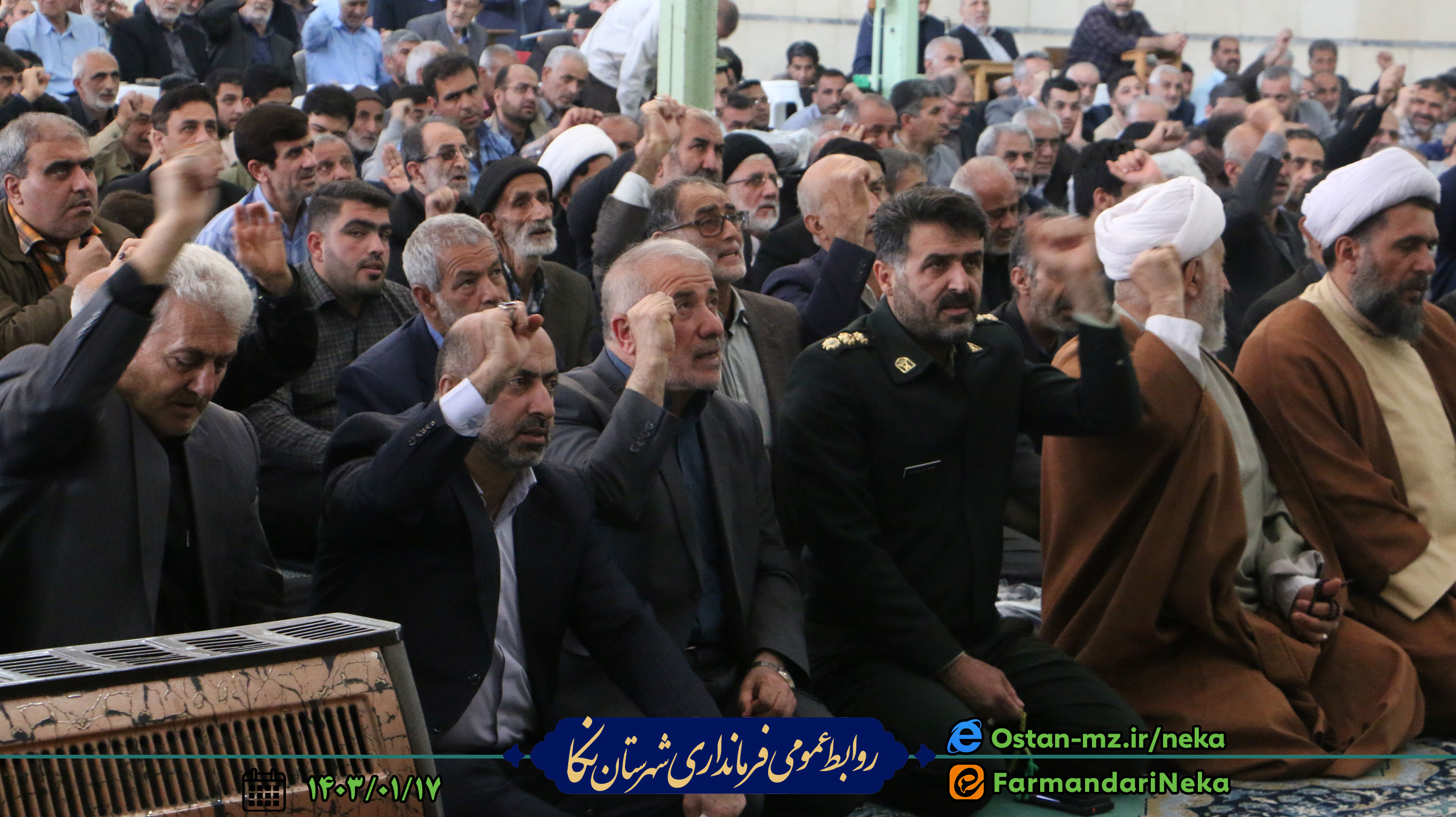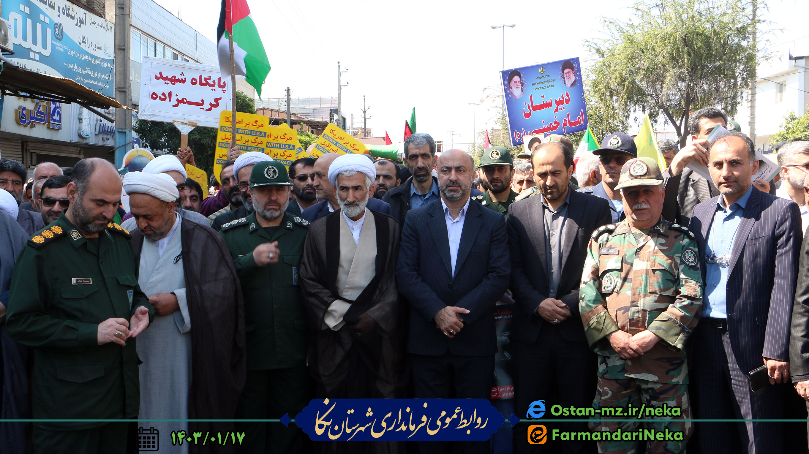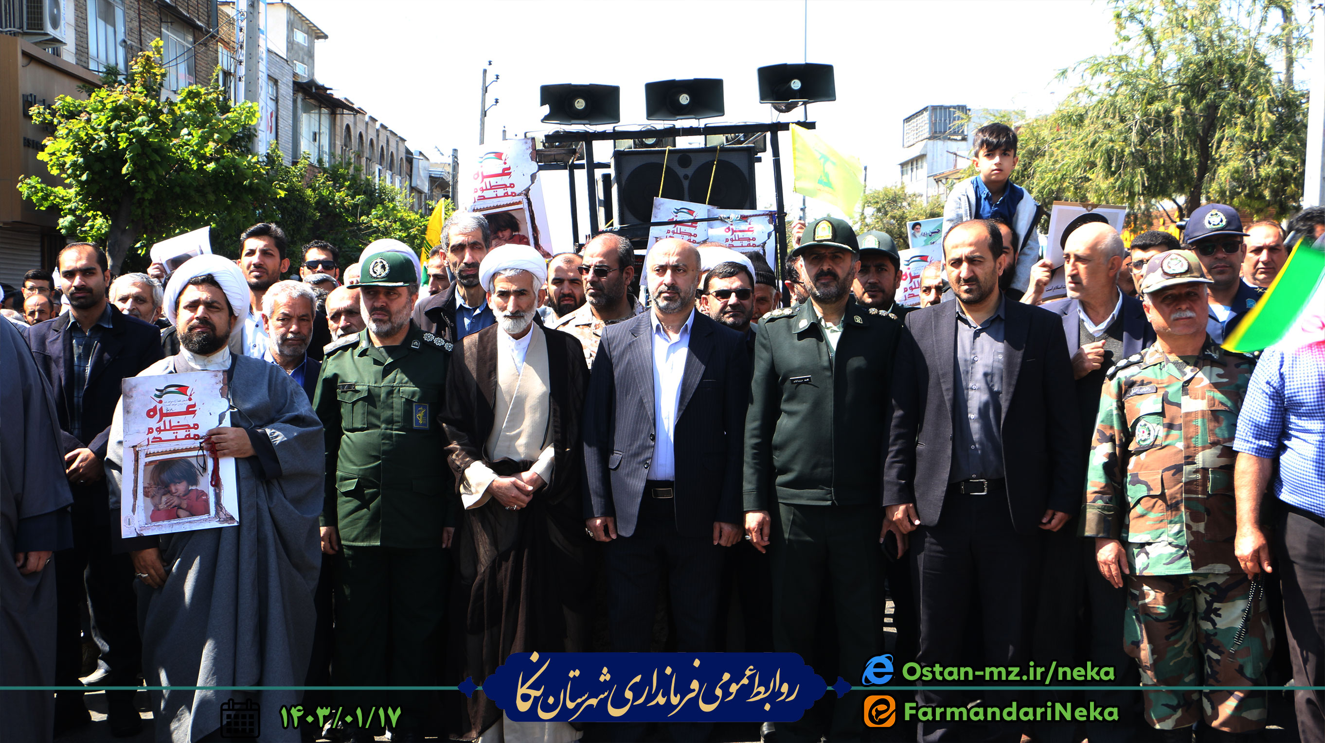 در این راهپیمایی، مردم شهرستان نکا، ضمن محکوم کردن جنایتهای رژیم صهیونیستی با سردادن شعارهای «اللهاکبر خامنهای رهبر»، «مرگ بر آمریکا» و «مرگ بر اسرائیل» از ناحیهو مقاومت بسیج شهرستان تا مصلی امام خمینی (ره) حمایت خودرا از مردم فلسطین و آزادسازی قدس اعلام کردند.