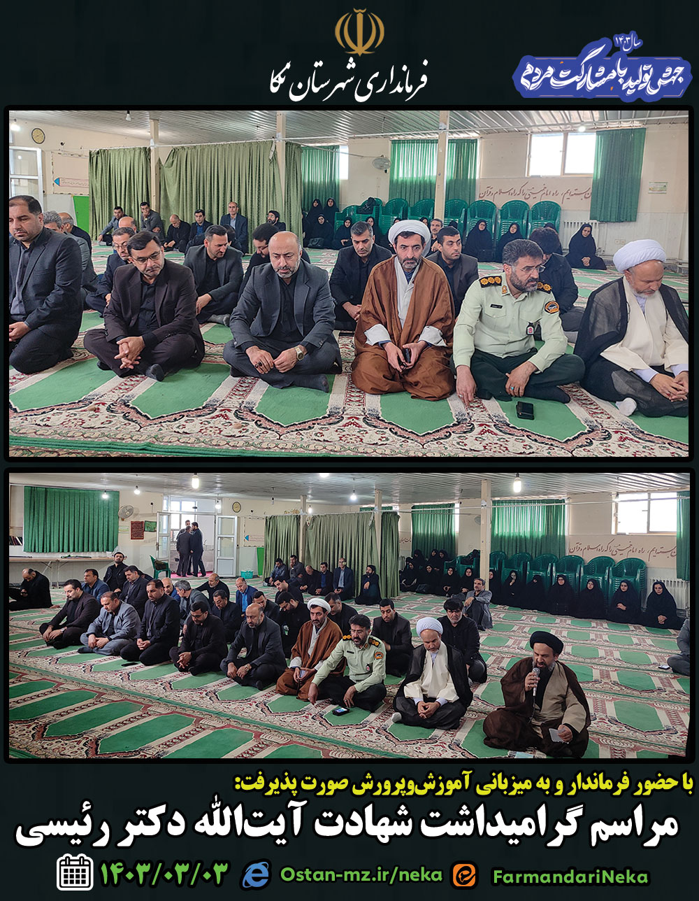 صبح امروز مراسم گرامیداشت شهادت آیتاللهدکتررئیسی و همراهان ایشان با حضور مرتضیرمضانی فرماندار نکا و مسئولین شهرستانی به میزبانی آموزش و پرورش و اتحادیه انجمنهای اسلامی دانشآموزان در نمازخانه آموزش و پرورش برگزار شد