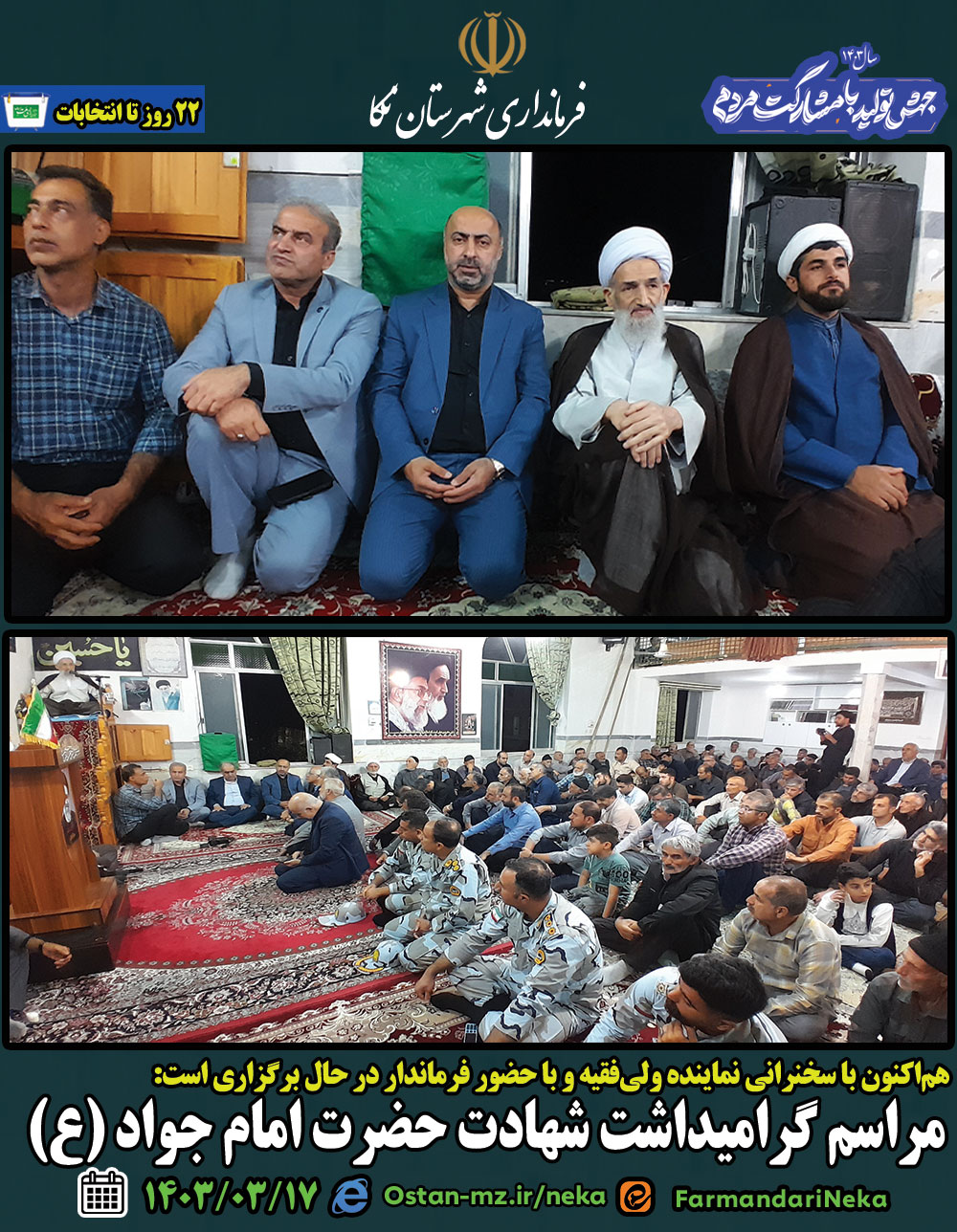 به گزارش روابطعمومی فرمانداری شهرستان نکا، مراسم گرامیداشت شب شهادت حضرت امام جواد (ع) با سخنرانی آیتاللهمحمدباقرمحمدیلائینی نماینده ولی فقیه در استان مازندران و با حضور مرتضیرمضانی فرماندار نکا به همراه چند تن از مدیران کل استان مازندران، هماکنون در مسجد کوثر روستای شیرکلا درحال برگزاری است.