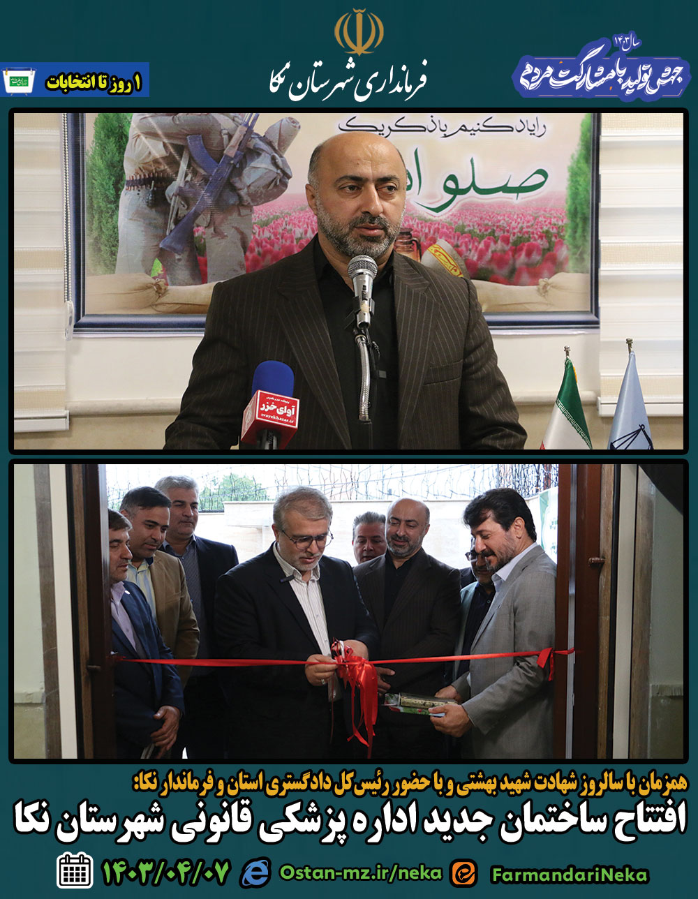 آیین افتتاح ساختمان جدید اداره پزشکی قانونی شهرستان نکا، همزمان با سالروز شهادت شهیدبهشتی و شهدای هفتم تیر و همچنین چهلمین روز شهادت شهیدرئیسی و شهدای خدمت با حضور عباسپوریانی رئیسکل دادگستری استان مازندران، مرتضیرمضانی فرماندار نکا و عباسی مدیر کل پزشکی قانونی استان در شهرستان نکا برگزار شد.