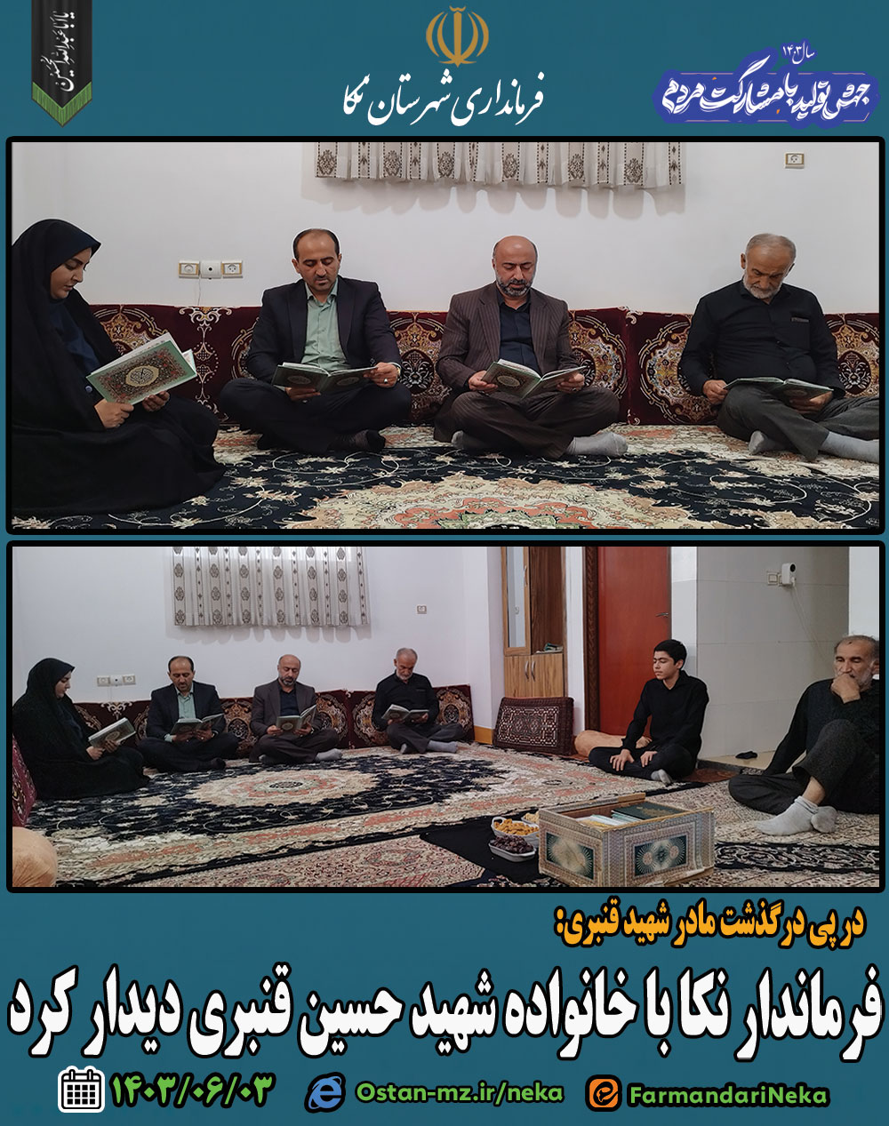 صبح امروز مرتضیرمضانی فرماندار نکا با حضور در منزل شهید حسینقنبری در روستای نودهک بخش مرکزی، ضمن دیدار با خانواده این شهید، درگذشت مادر شهید را تسلیت به این خانواده گفت.