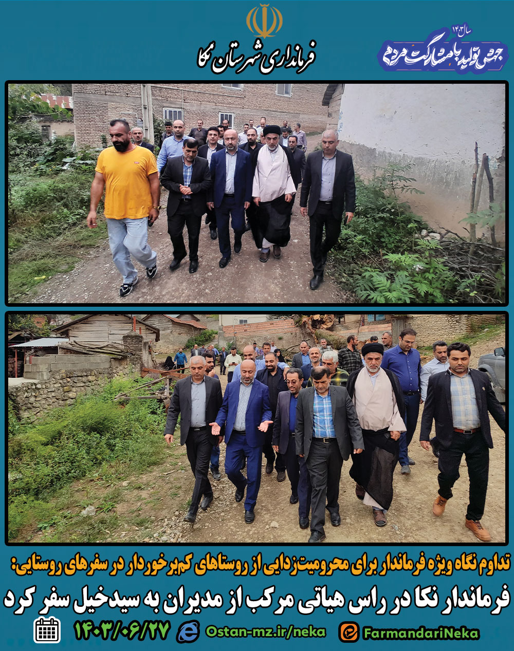 عصر امروز مرتضیرمضانی فرماندار نکا به همراه معاون امور عمرانی، بخشدار هزارجریب و مدیران ادارههای آب و فاضلاب، مخابرات، راهداری، بنیاد شهید، کمیته امداد، بهزیستی، منابع طبیعی، گاز، بنیاد مسکن، بهداشت، جهاد کشاورزی، امور منابع آب، بهمنظور بازدید میدانی از روستای سیدخیل بخش هزارجریب، راهی این روستا شد.