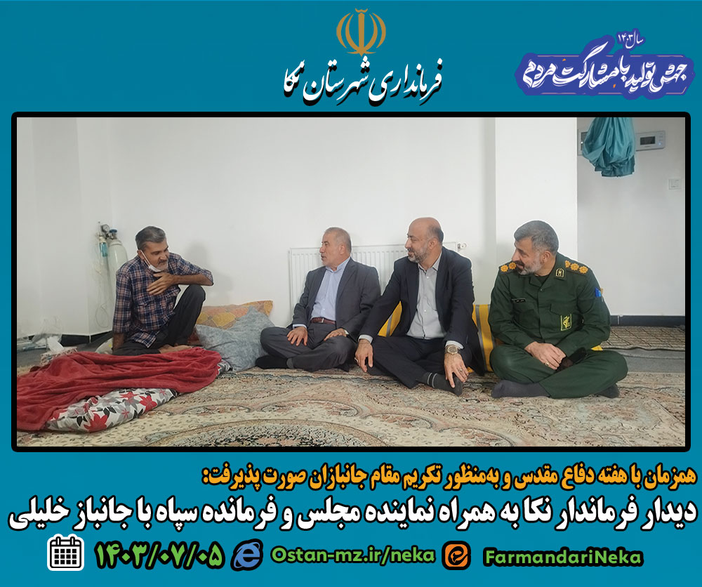 صبح امروز، همزمان با هفته دفاع مقدس و بهمنظور تکریم جایگاه جانبازان مرتضیرمضانی فرماندار نکا به همراه شریعتی نماینده مجلس و نادعلی فرمانده ناحیه مقاومت بسیج شهرستان با حضور در منزل جانبازخلیلی با این جانباز دوران دفاع مقدس دیدار کردند.