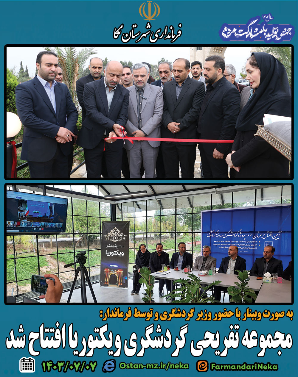 همچنین آیین افتتاح مجموعه تفریحی گردشگری ویکتوریا نیز توسط مرتضیرمضانی فرماندار نکا و با حضور ایزدی مدیر کل میراث فرهنگی استان مازندران در این مجموعه تفریحی برگزار شد.