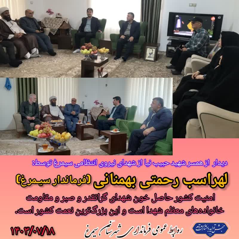 به گزارش روابط عمومی فرمانداری شهرستان سیمرغ،امروز چهارشنبه ۱۸ مهر ماه لهراسبرحمتیبهمنانیفرماندارسیمرغ با همراهی حجت الاسلام خانلری امام جمعه، مرزبان بخشدار تالارپی به همت بنیاد شهید و امور ایثارگران به مناسبت گرامیداشت هفته نیروی انتظامی با خانواده معظم شهید مختار حبیب نیا از شهدای گرانقدر نیروی انتظامی سیمرغ دیدار کرد.