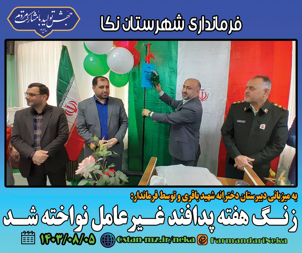 صبح امروز آیین نواختن زنگ هفته پدافند غیرعامل همزمان با سراسر کشور با حضور مرتضیرمضانی فرماندار نکا، و مسئولین شهرستانی به همراه دانش آموزان در دبیرستان دخترانه شهید باقری برگزار شد.
