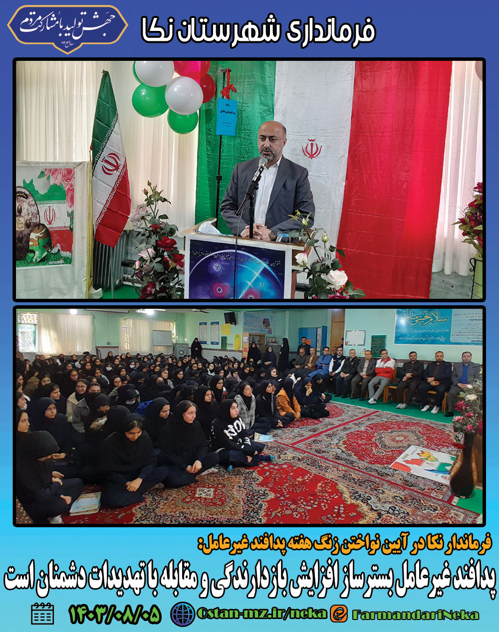 نماینده عالی دولت در شهرستان نکا آشنایی با اصول پدافند غیرعامل را یکی از نکات مهم و ضروری دانست و خطاب به معلمان این دبیرستان تاکید کرد: آشنا ساختن دانش آموزان با اصول پدافند غیرعامل برای مقابله با خطراتی که در جنگ ترکیبی نوین امروز آنها را تهدید میکند، به ویژه جنگ دشمن در فضای مجازی، امری ضروری است که با کمک معلمان صورت پذیرد.