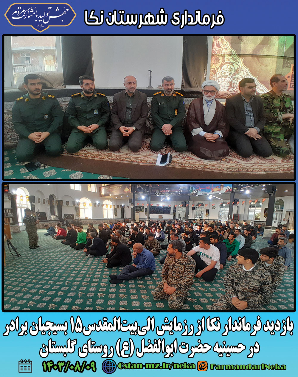به گزارش روابط عمومی فرمانداری شهرستان نکا، عصر امروز مرتضیرمضانی فرماندار نکا بههمراه نادعلی فرمانده ناحیه مقاومت بسیج شهرستان و قاسمی معاون سیاسی، امنیتی و اجتماعی در ادامه روند بازدید از برگزاری رزمایش الیبیتالمقدس۱۵ که با حضور گردانهای بسیج و بسیجیان شهرستان نکا و با هدف حفظ انسجام رزمی و افزایش توان دفاعی برگزار شد، با حضور در حسینیه حضرت ابوالفضل(ع) روستای گلبستان از اجرای این رزمایش توسط بسیجیان برادر بازدید کرد.