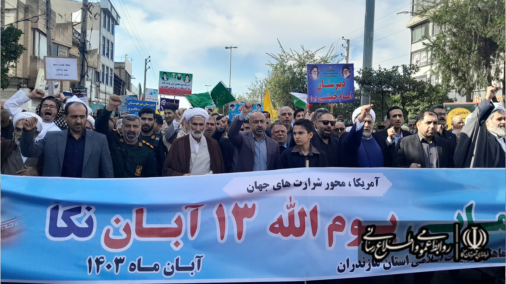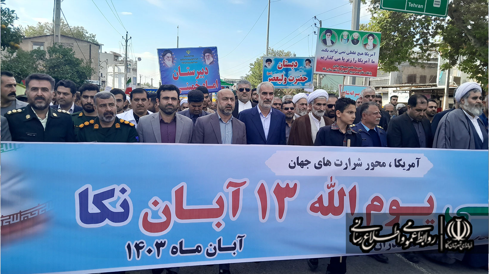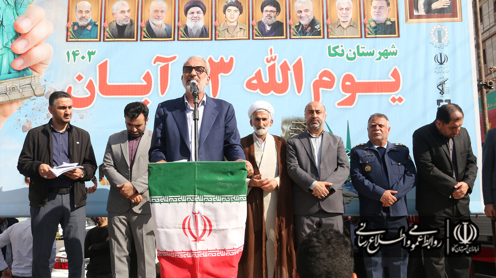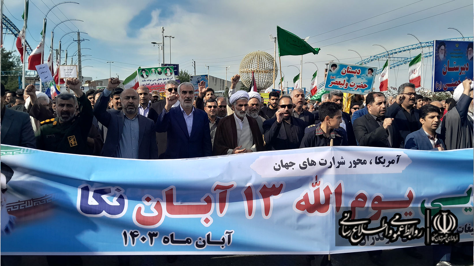 به گزارش روابطعمومی فرمانداری نکا، صبح امروز همزمان با برگزاری مراسم ۱۳ آبان روز استکبارستیزی در سراسر ایران اسلامی، دانشآموزان و مردم شهرستان نکا با همراهی یوسفنوری، استاندار مازندران، مرتضیرمضانی فرماندار نکا و حجتالاسلاممحمدیلائینی امامجمعه و سایر مسئولان در صفوف تظاهرکنندگان علیه استکبار جهانی به سرکردگی آمریکای جنایتکار، اسرائیل کودککش و دیگر سردمداران غرب شرکت کردند و حماسهای دیگر در دفتر پرافتخار این شهرستان ثبت کردند.