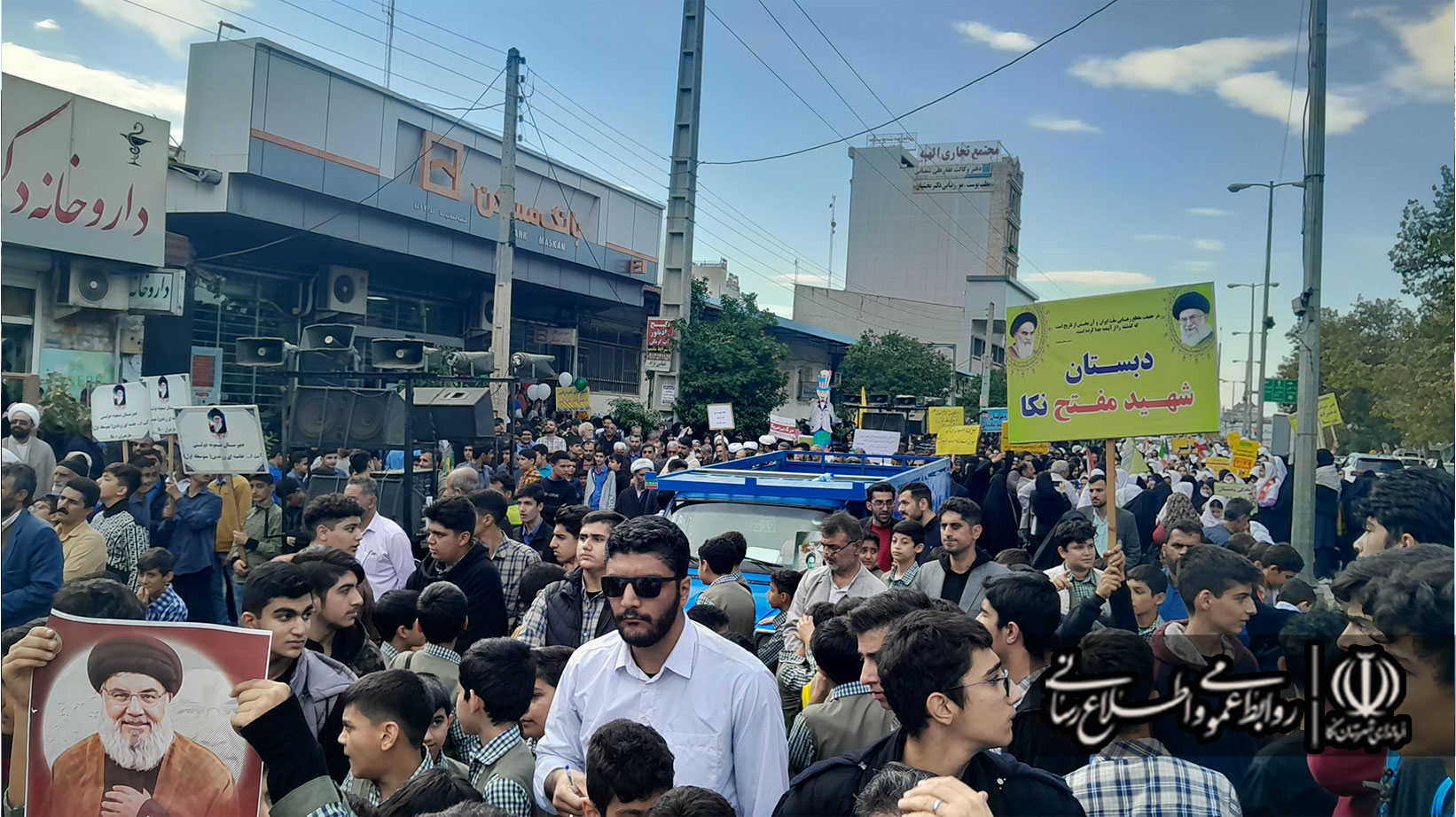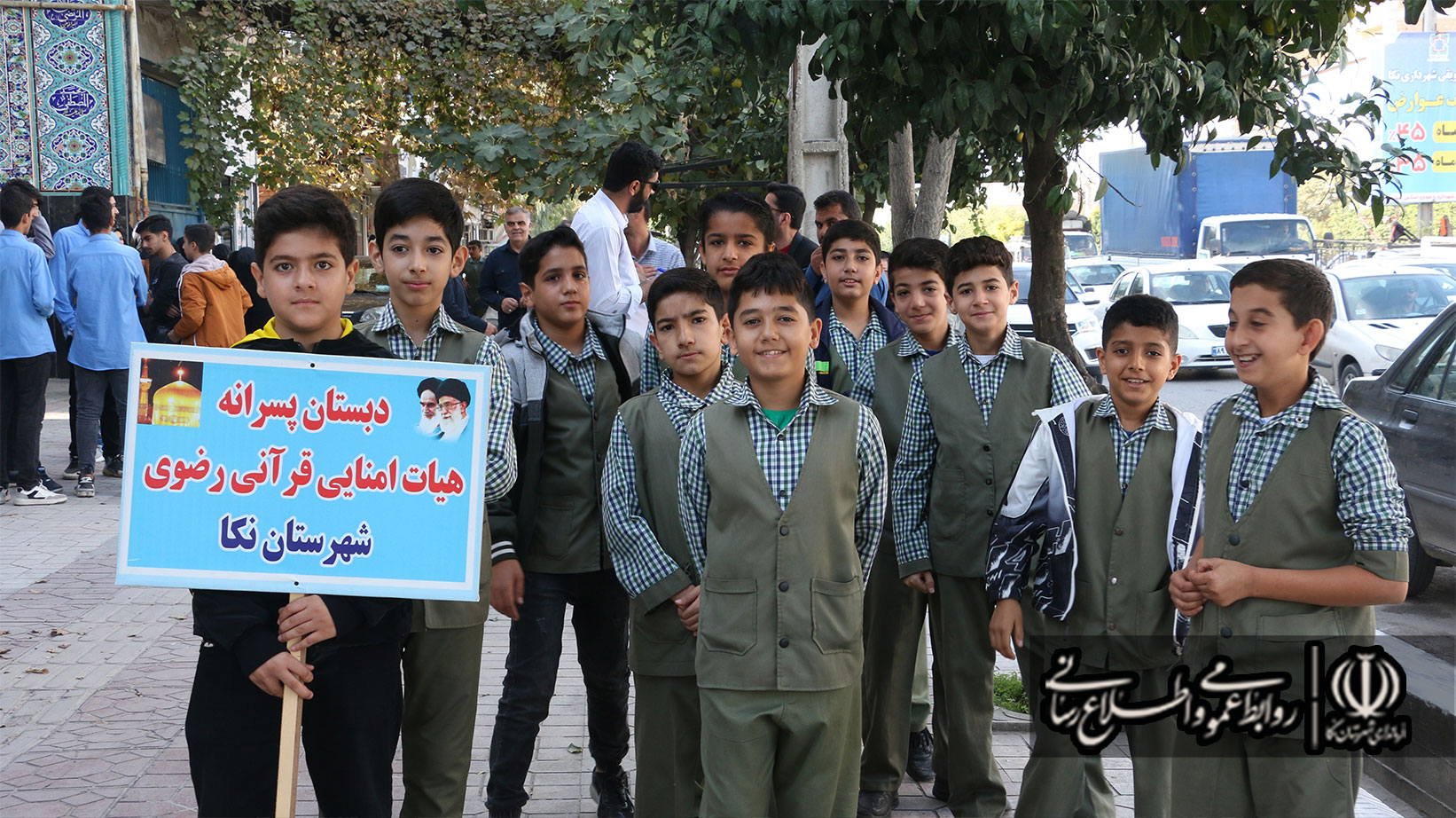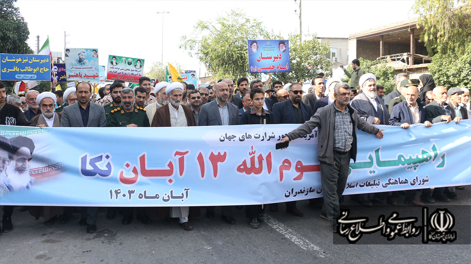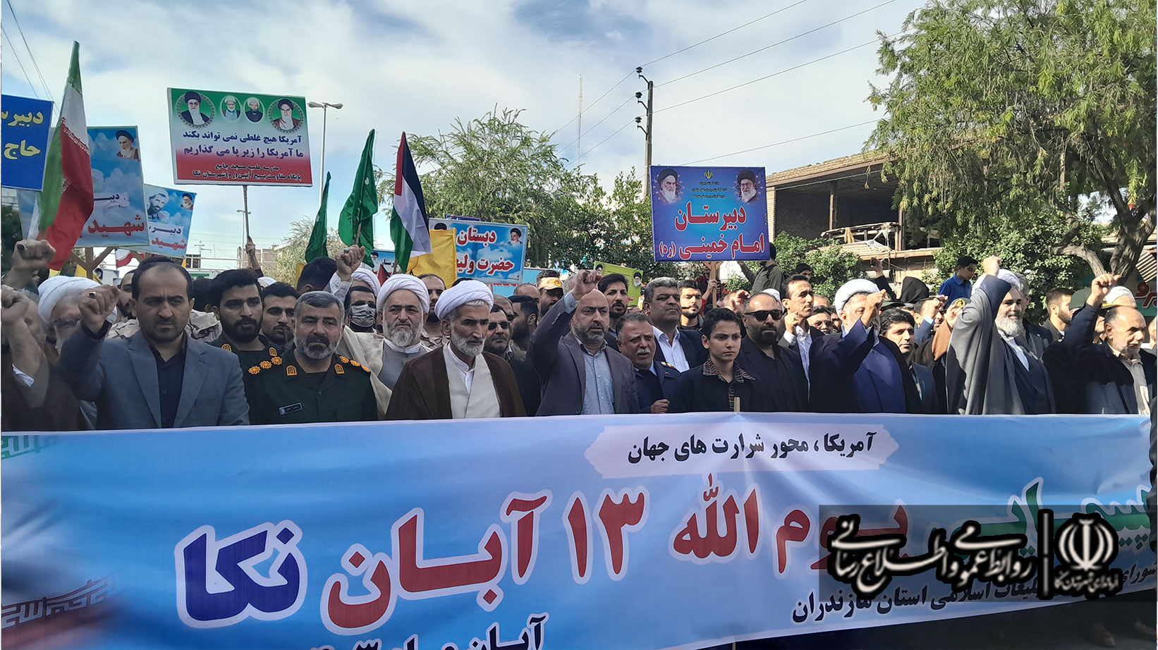 شایان ذکر است، در این مراسم که با استقبال کمنظیر دانشآموزان و مردم نکا همراه بود، مسیر ناحیه مقاومت بسیج تا مصلای امامخمینی(ره)، با سردادن شعارهایی علیه جنایتکاران جهان پیموده شد و در نهایت نیز این مراسم با به آتش کشیدن نمادین پرچمهای آمریکا و اسرائیل، خواندن بیانیه و سخنرانی استاندار خاتمه یافت.