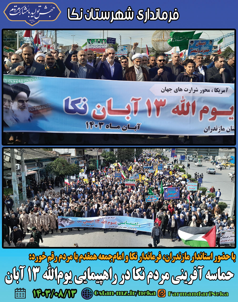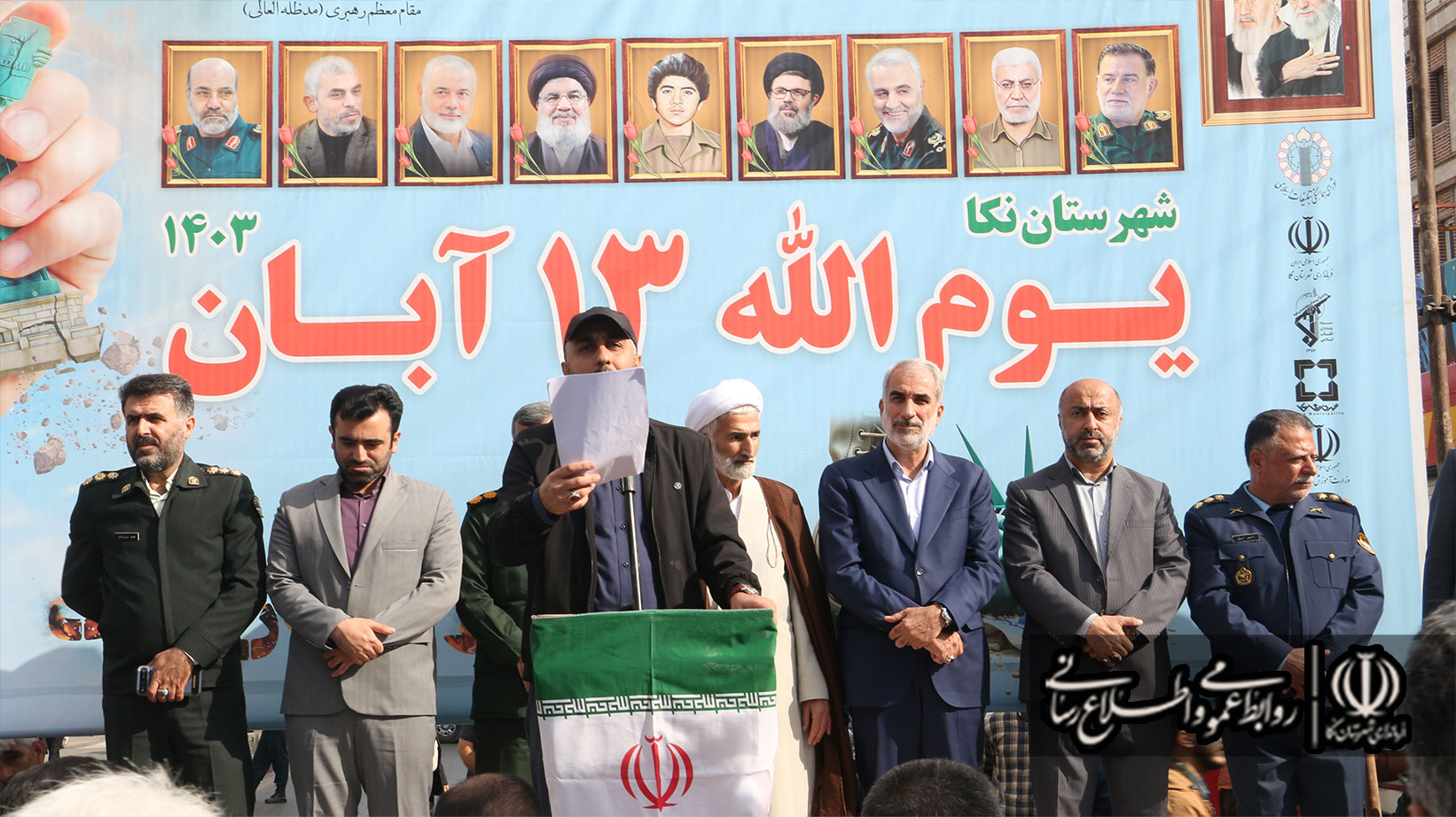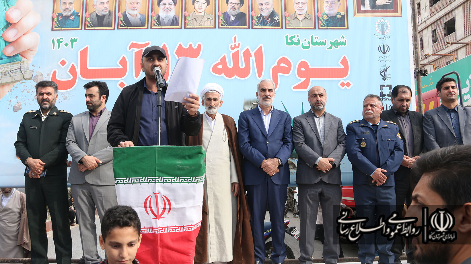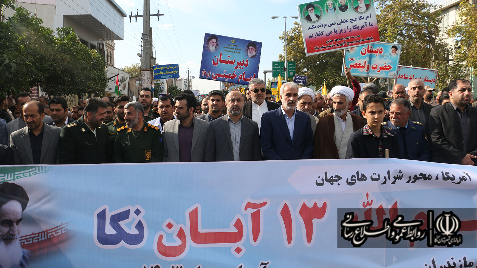 صبح امروز همزمان با برگزاری مراسم ۱۳ آبان روز استکبارستیزی در سراسر ایران اسلامی، دانشآموزان و مردم شهرستان نکا با همراهی یوسفنوری، استاندار مازندران، مرتضیرمضانی فرماندار نکا و حجتالاسلاممحمدیلائینی امامجمعه و سایر مسئولان در صفوف تظاهرکنندگان علیه استکبار جهانی به سرکردگی آمریکای جنایتکار، اسرائیل کودککش و دیگر سردمداران غرب شرکت کردند و حماسهای دیگر در دفتر پرافتخار این شهرستان ثبت کردند.