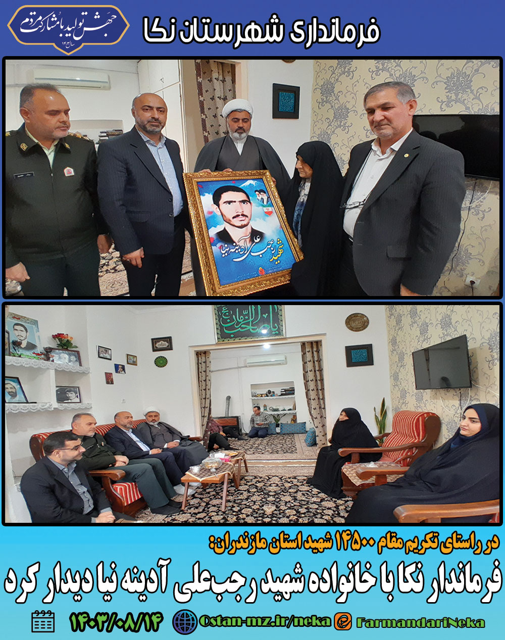 صبح امروز در راستای تکریم ۱۴۵۰۰ شهید استان مازندران مرتضیرمضانی فرماندار نکا با حضور در منزل شهید رجبعلی آدینه نیا با خانواده این شهید دیدار کرد