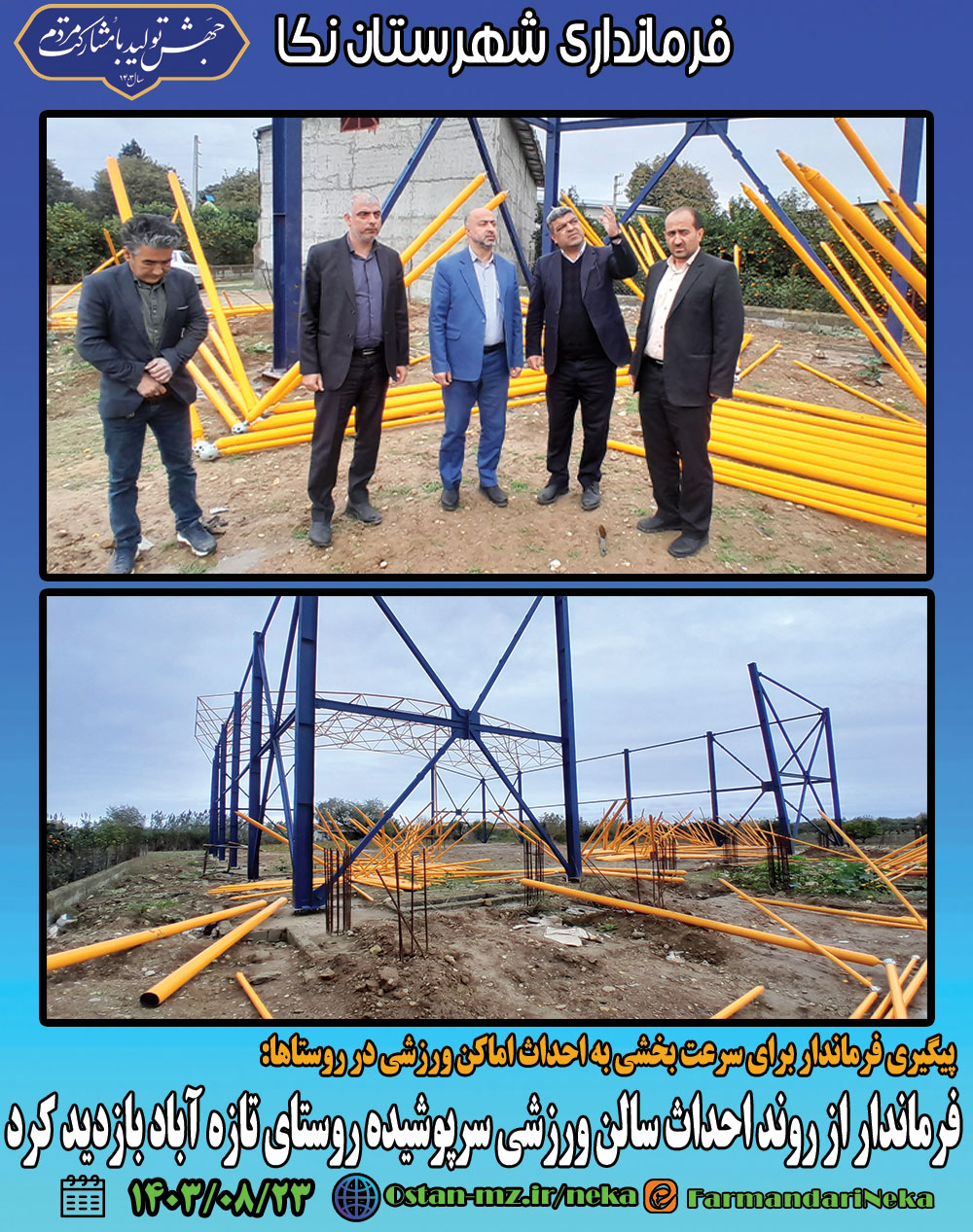 صبح امروز مرتضیرمضانی فرماندار نکا در ادامه روند بازدید خود از احداث اماکن ورزشی در روستاها با حضور در روستای تازهآباد از روند احداث سالن ورزشی سرپوشیده در این روستا بازدید کرد.