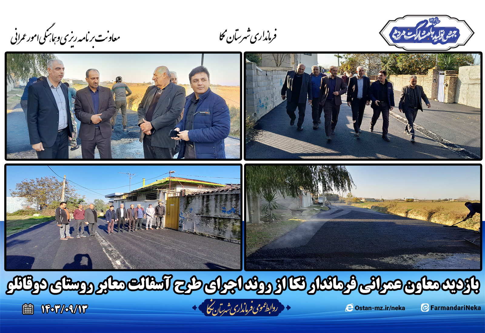 صبح امروز علینژاد معاون هماهنگب امور عمرانی فرماندار نکا به همراه جمشیدی بخشدار مرکزی با حضور در روستای دوقانلو بخش مرکزی از روند اجرای طرح آسفالت معابر این روستا بازدید کردند.