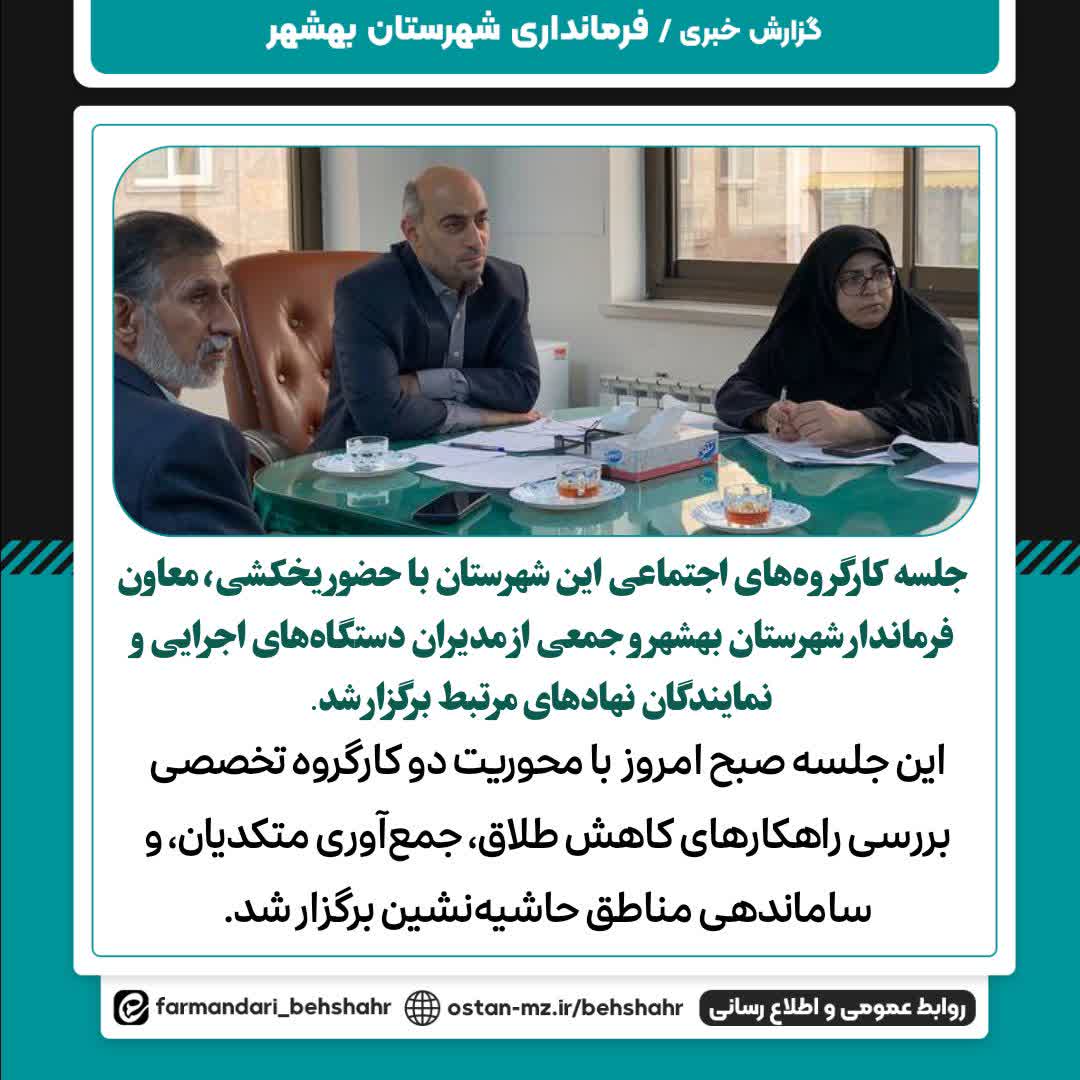 به گزارش روابط عمومی فرمانداری شهرستان بهشهر، جلسه کارگروههای اجتماعی این شهرستان با حضور یخکشی، معاون فرماندار شهرستان بهشهر و جمعی از مدیران دستگاههای اجرایی و نمایندگان نهادهای مرتبط برگزار شد. این جلسه با محوریت بررسی راهکارهای کاهش طلاق، جمعآوری متکدیان، و ساماندهی مناطق حاشیهنشین برگزار شد.