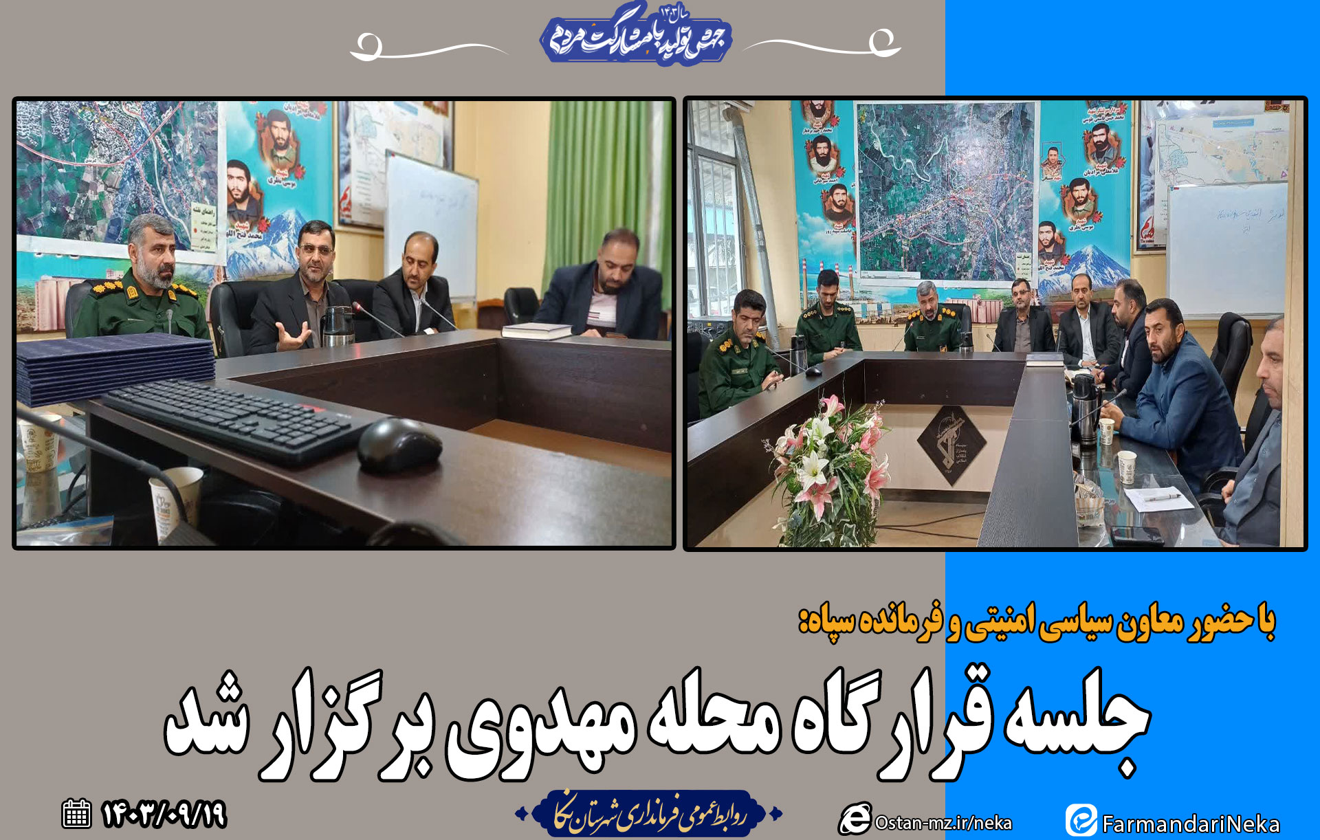 جلسه قرارگاه محله مهدوی با حضور علیرضاقاسمی معاون سیاسی امنیتی فرمانداری شهرستان نکا و نادعلی فرمانده ناحیه مقاومت بسیج در سالن جلسات ناحیه مقاومت بسیج شهرستان نکا برگزار شد.