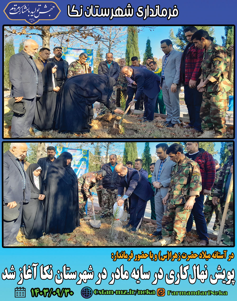 صبح امروز و در آستانه میلاد حضرت زهرا(س) پویش نهالکاری در سایه مادر شهرستان نکا، با حضور مرتضیرمضانی فرماندار نکا، خانواده #شهیدمدافعحرمحسینمشتاقی و مسئولین شهرستانی در بوستان مادر آغاز شد.