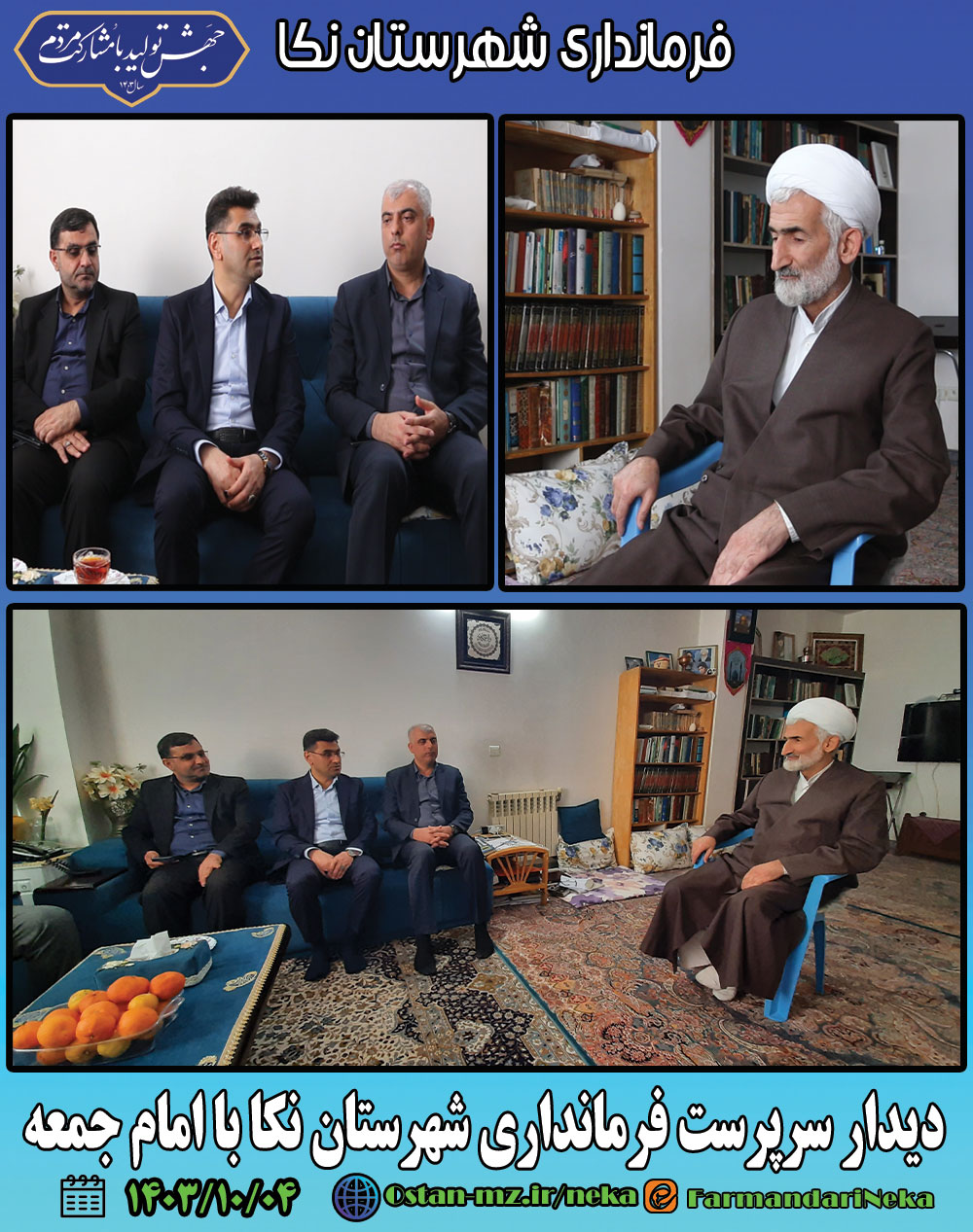 به گزارش روابط عمومی فرمانداری شهرستان نکا، ظهر امروز مهدیداودی سرپرست فرمانداری شهرستان نکا با حضور در منزل حجتالاسلاموالمسلمینمحمدصادقمحمدیلائینی امام جمعه شهرستان با امام جمعه دیدار کرد.