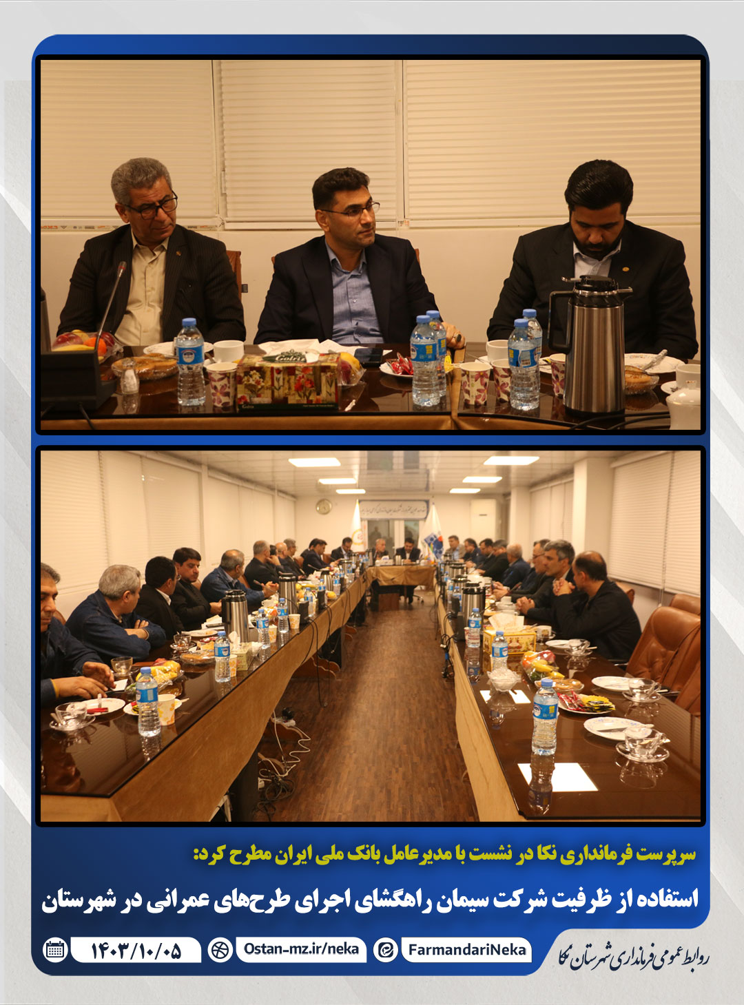 به گزارش روابط عمومی فرمانداری شهرستان نکا، عصر امروز نشست مشترک مهدیداودی سرپرست فرمانداری شهرستان نکا با نجارزاده مدیرعامل بانک ملی ایران، شریعتی نماینده مردم شرق استان در مجلس و فرمانی مدیرعامل شرکتهای سیمان کشور، در شرکت سیمان مازندران برگزار شد.