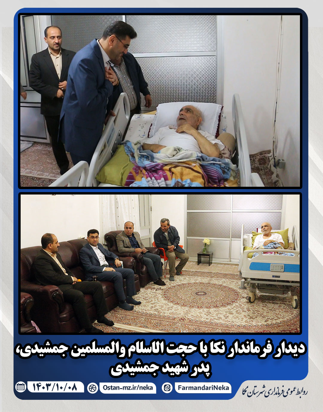 دکترداودی فرماندار نکا به همراه معاون سیاسی، امنیتی و اجتماعی و بخشدار مرکزی با حضور در منزل حجتالاسلاموالمسلمینحاجحسنجمشیدی، پدر شهید جمشیدی و نماینده ۳ دوره مردم شرق استان در مجلس شورای اسلامی، از این آزاده دوران دفاع مقدس عیادت کرد.