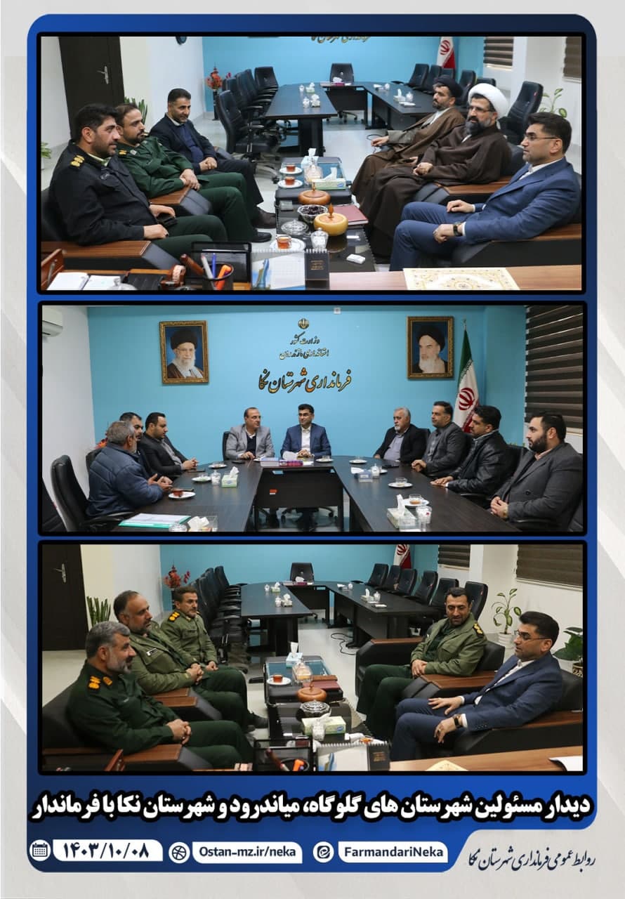 در این دیدارها امام جمعه، فرماندهان فراجا و سپاه، نمایندگی ولی فقیه در سپاه گلوگاه، فرماندار و بخشداران و رئیس شورای شهرستان میاندرود و فرمانده ناحیه مقاومت بسیج شهرستان نکا با حضور در فرمانداری نکا بر افزایش تعامل و همکاری تاکید نمودند.