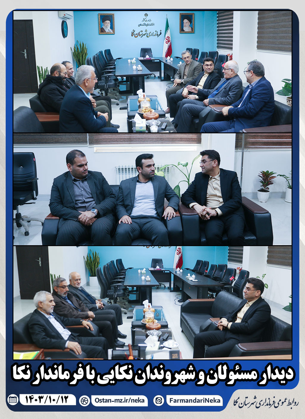 در امتداد دیدارهای مسئولان و شهروندان نکایی با دکترداودی فرماندار نکا، صبح چهارشنبه ۱۲ دی ماه نیز جمعی از شهروندان نکایی به همراه مسئولان این شهرستان با حضور در فرمانداری نکا با نماینده عالی دولت دیدار کردند.