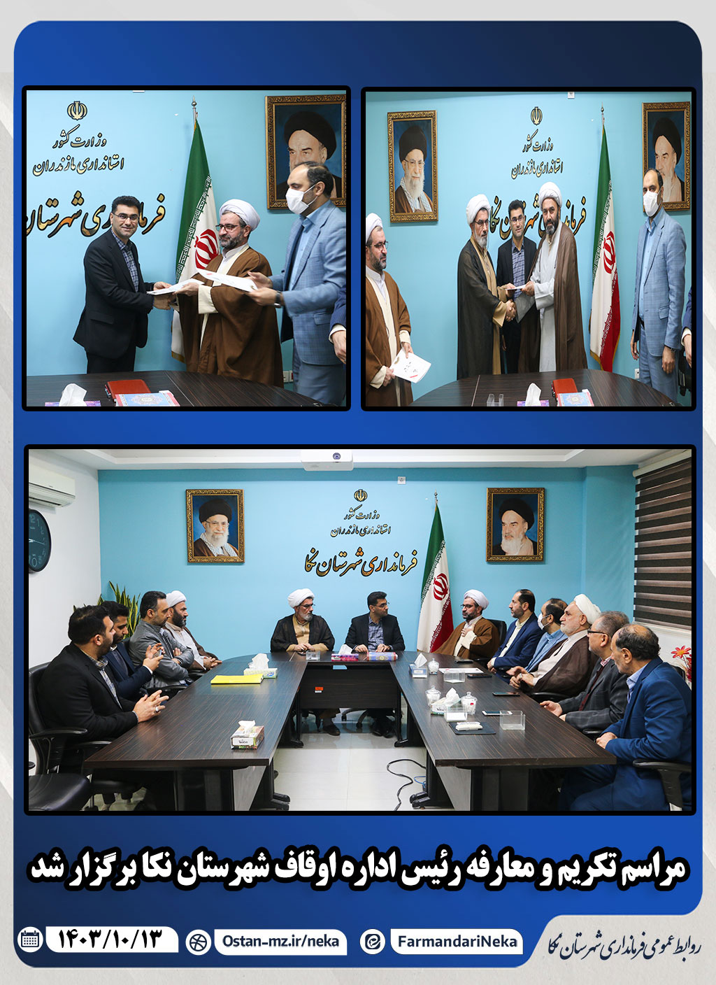 مراسم تکریم و معرفی رییس اداره اوقاف و امور خیریه شهرستان نکا، صبح روز پنج شنبه مورخه ۱۳ دی ۱۴۰۳ با حضور دکترداودی فرماندار نکا و حیدری مدیر کل اوقاف و امور خیریه مازندران در فرمانداری برگزار گردید.